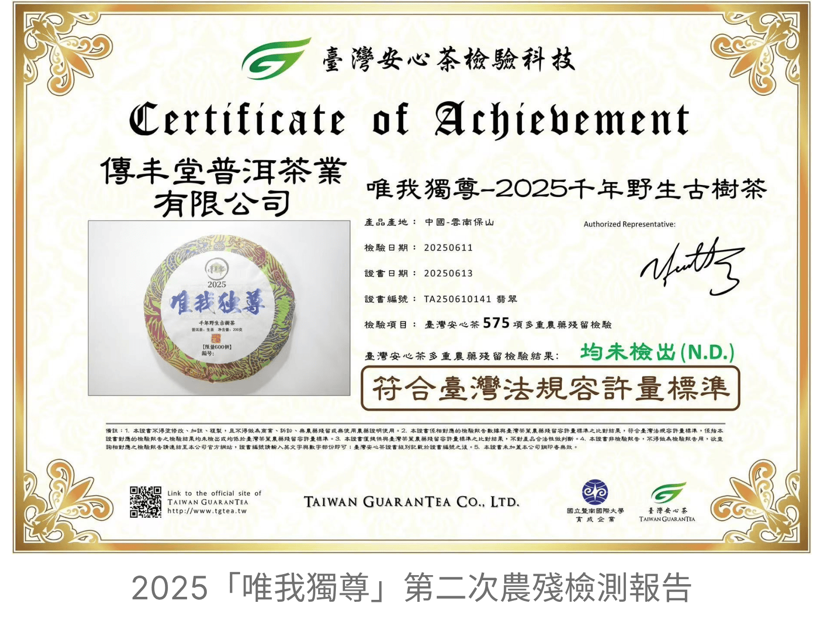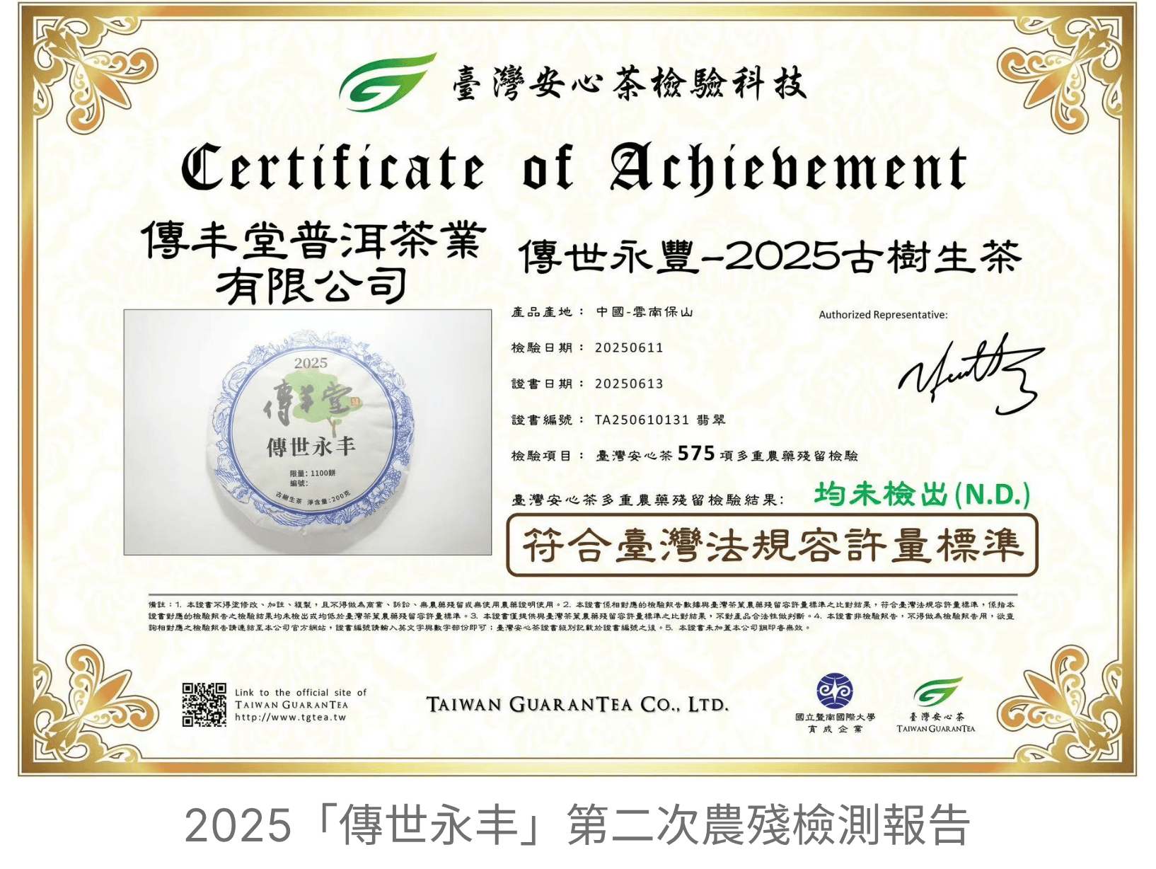 2025年保山茶區,「傳世永丰」、「瀑布山泉地」、「唯我獨尊」三款優質好茶第二次農藥殘留檢測報告出爐,均是業界最高標準——「均未檢出」!