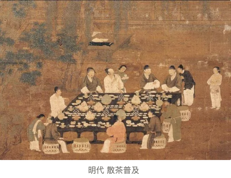 明代:散茶的普及與炒青工藝進入到了明代,朱元璋為體恤百姓,下令「罷造龍團,惟採芽茶以進」,意為不再生產龍團鳳餅,改為採摘芽葉製散茶,貢茶制度得到簡化。也因如此,茶從原先宮廷貴族、文人雅士的專享,逐漸走向平民化,在民間廣為流傳。與此同時,製茶工藝也得到了創新,不僅有蒸青散茶,還有炒青散茶的出現。炒青工藝能更好地保留茶葉香氣,口感更加濃厚醇和。因為高溫炒制能迅速脫水,鎖住香氣和風味物質,同時激發茶葉中的芳香物質,增強茶湯的濃厚度和回甘感;而蒸青工藝雖能保留茶葉的鮮爽和綠色,但香氣和口感較為清淡。