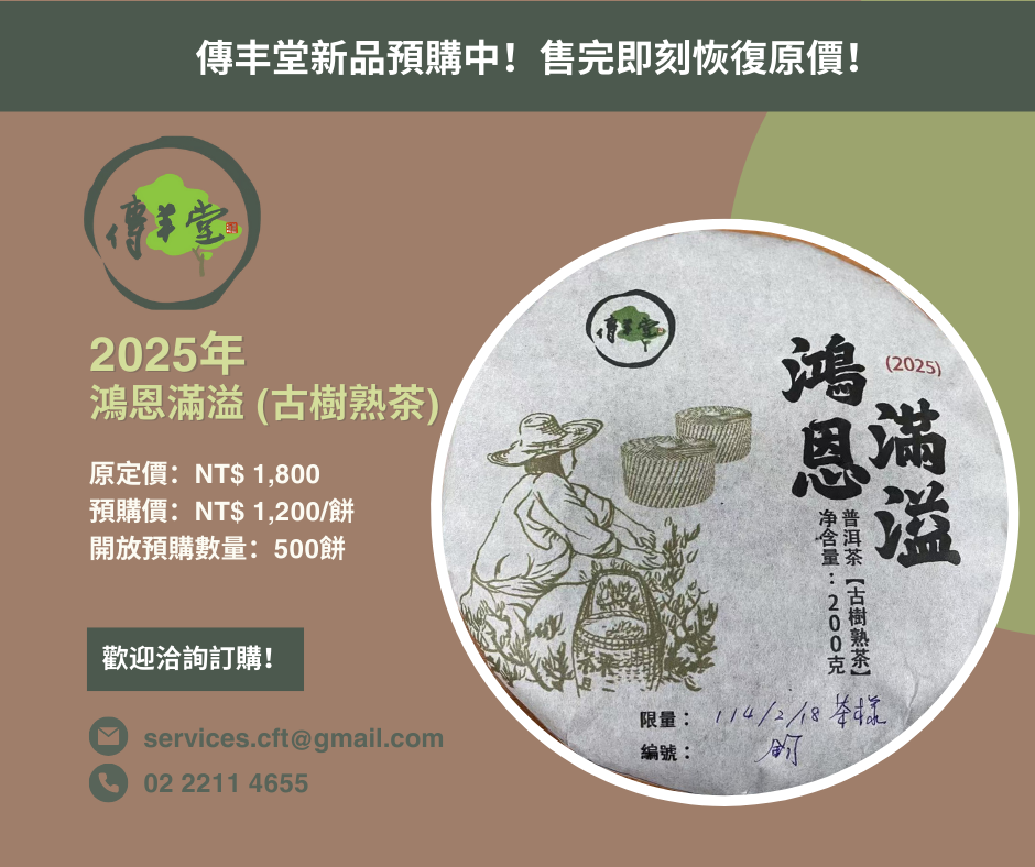 2025「鴻恩滿溢」古樹熟茶- 野生古樹春茶:採用雲南保山茶區2024年野生古茶樹純料春茶,使用「小堆離地發酵」工藝,五次翻堆,歷時兩個多月。每餅200克,茶湯濃稠飽滿,香氣優雅,甜潤滋味帶點苦,展現高端熟茶的極致風味。- 健康保障:通過575項農藥殘留檢測(零檢出,編號:TA250218071),乾淨衛生,無渥堆酸腥味。新茶即好喝,男女老少皆宜,陳放2-3年後滋味更佳。- 感恩之作:以「鴻恩滿溢」命名,代表傳丰堂對天地、自然與茶友的感恩。此款旗艦級熟茶不僅是品飲享受,更傳遞了愛、健康與幸福。🔥「鴻恩滿溢」火熱預購中!- 自飲:香氣優雅、滋味甜潤微苦,帶來舒適體感。- 送禮:高端熟茶,傳遞健康幸福與感恩心意。- 收藏:越陳越香,具有增值潛力。【原定價】:NT$ 1,800【預購價】:NT$ 1,200【開放預購數量】:500餅