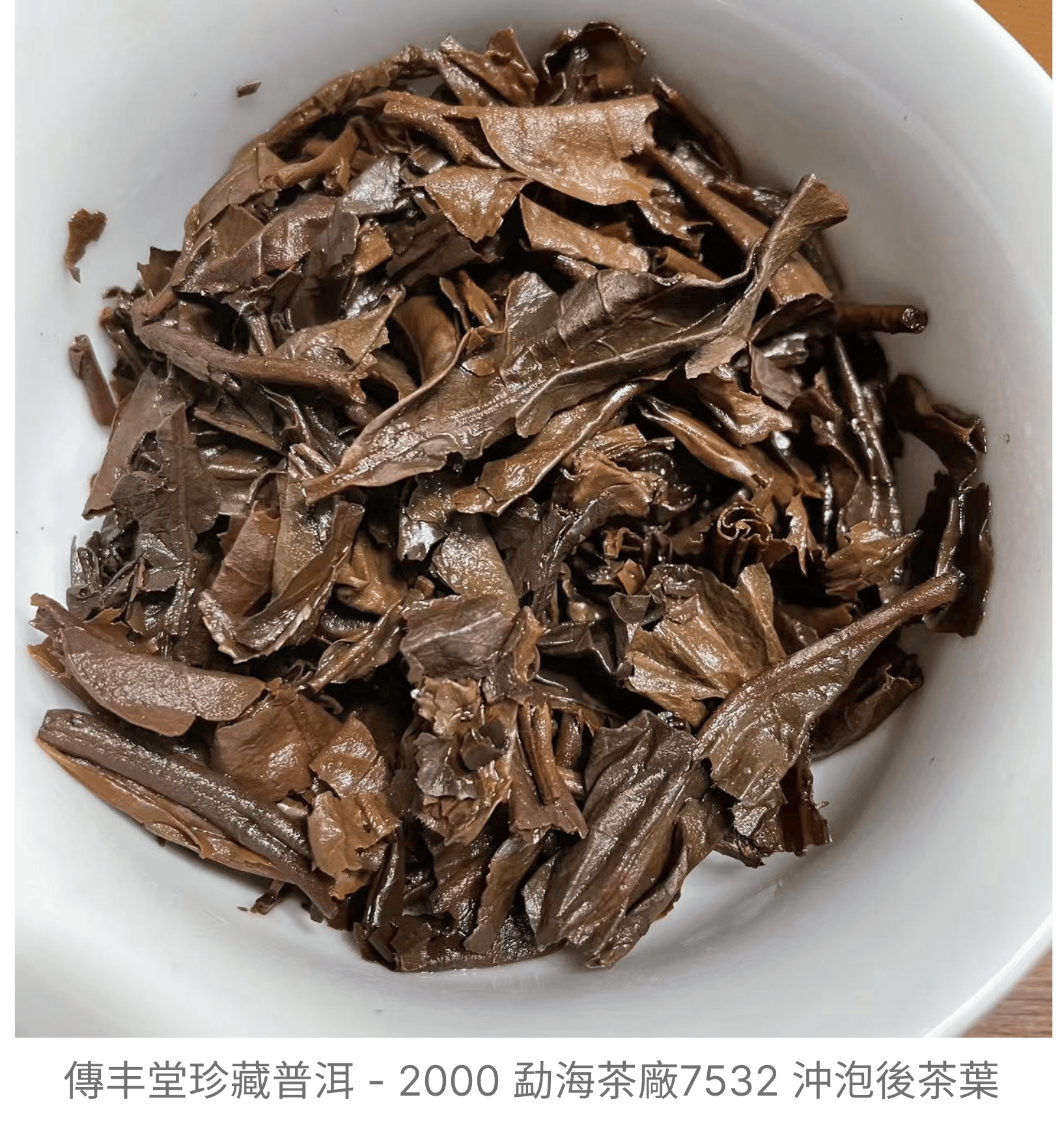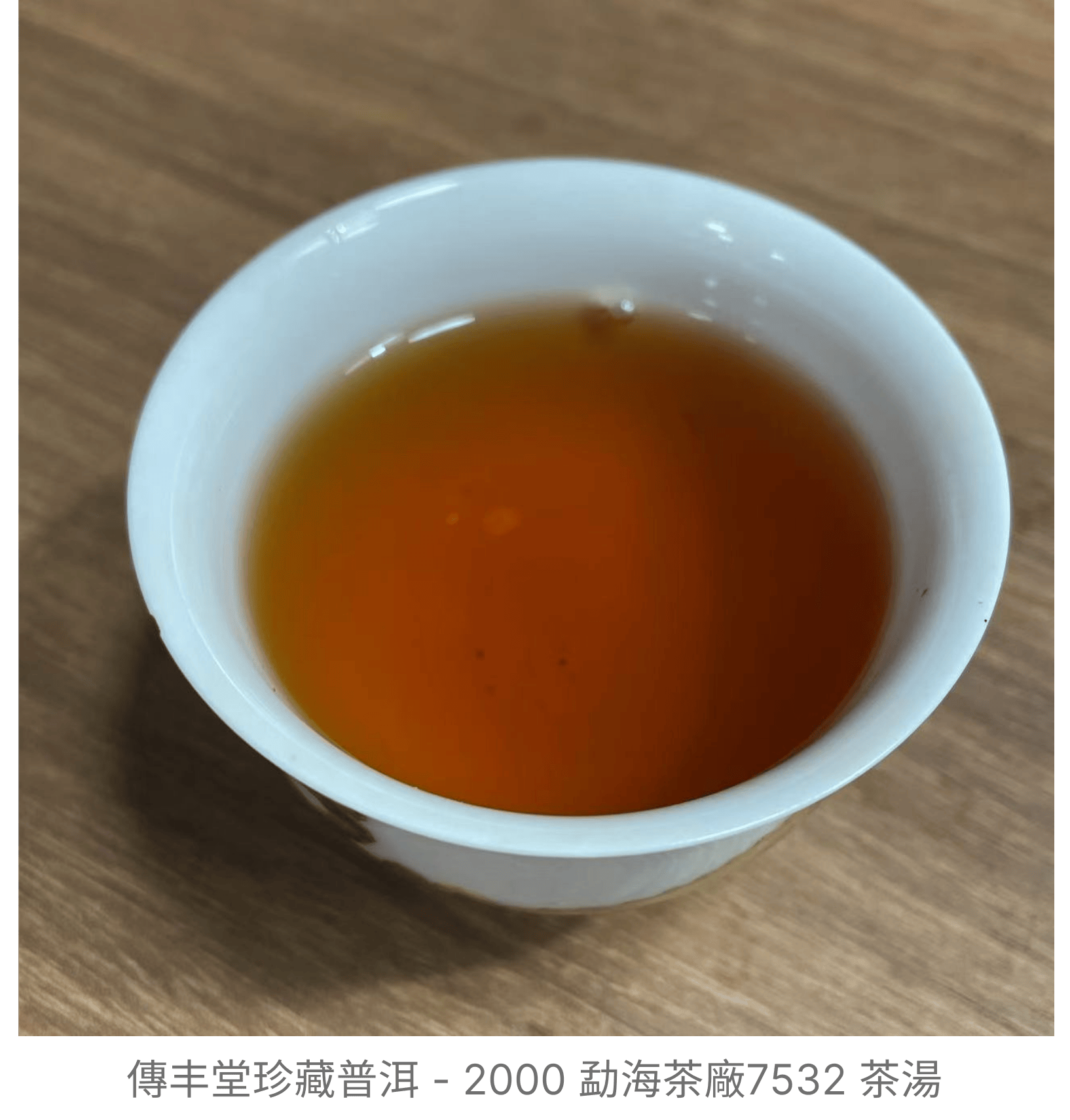 一早送女兒去考場後,和老婆、大女兒直接到茶室報到,老婆練習書法、大女兒讀書,我則品茶試茶。這款7532茶品,最讓我印象深刻,其早期的香港倉儲,接續轉來台灣,目前放在本堂好宅內繼續藏養。其香氣優雅,完全沒有倉味;茶餅面金毫撒面,很乾淨、討喜;栗黃色茶湯,茶湯飽滿滑順,第一泡的梅子韻,接下來的木質樟香,微苦澀,滋味豐富,生津回甘。至今25年的茶齡,已經可以感受到其芳樟香、陽光味、古樹醇、大山氣、野性強等茶韻隨時間陳化熟成所轉化的陳年老韻,讓我邊品邊感受「變老」的美好。有了「時間歲月」的淬煉與積累,其蘊含的底蘊更加令人愛不釋手,一款值得您邊喝邊藏養的好茶,值得推薦!👍👍