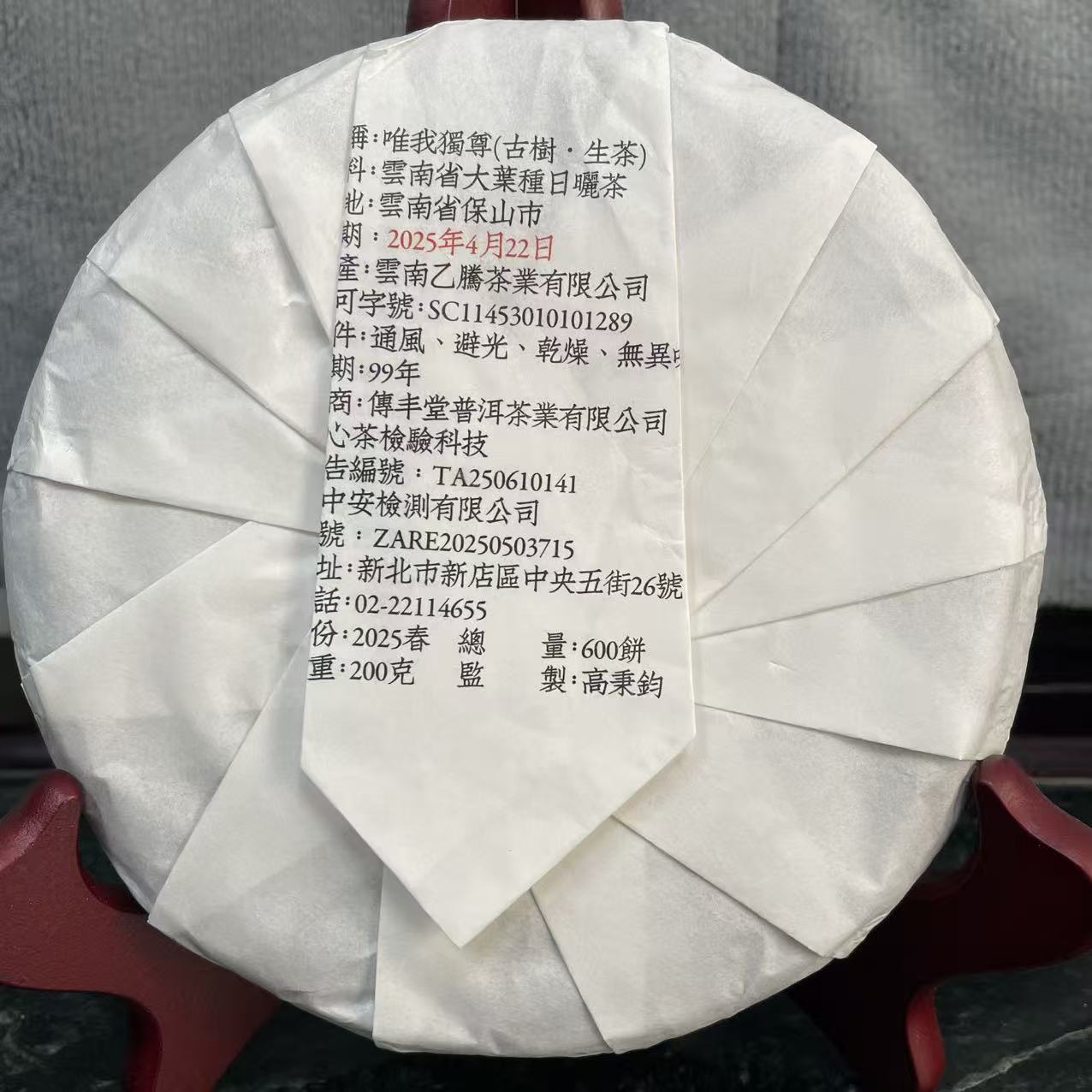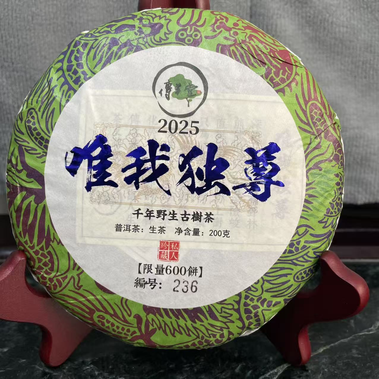 2025「唯我獨尊」千年野生古樹茶(生茶)千年野生古樹純料:精選雲南保山約2500~2800公尺秘境茶區大理種野生型古樹茶,樹齡均齡在七百~千年以上,十分稀有。每餅200克,共限量600餅。茶湯特質:蘊含高山野生茶野韻,散發獨特愉悅的清新氣息,充滿大自然的芬芳。茶湯細緻綿密,滋味層次豐富,口感甜潤飽滿,苦澀感低,回甘生津持久。健康保障:傳統工藝製作,越陳越香,且每片皆有獨立身分編號;通過575項農殘檢測(零檢出,編號:TA250610141, TA250821151),野生純淨,安全放心。特殊意義:採用千年樹齡的稀世原料,「唯我獨尊」表現出茶樹千年的壽命及其旺盛的生命力,我們選用「量少質精」的深山野生茶樹,同時也傳達了我們對自然的敬畏和對品質的堅持。