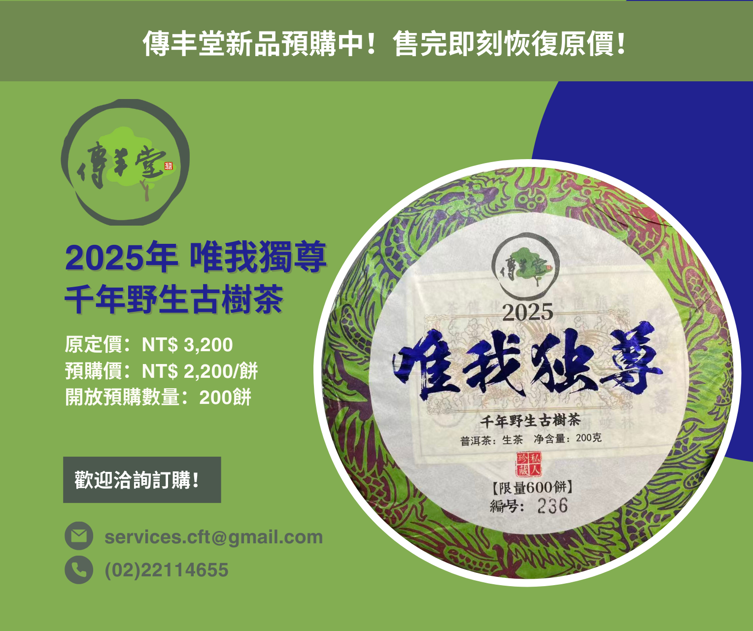 各位茶友有福啦!傳丰堂堅持採用頭春茶、春茶為原料,並選用傳統、衛生工藝產製,目的就是要讓茶品能夠越陳越香、有質有韻。因優質原料產量有限,每批次皆為限量精品。為了感謝茶友支持,也為了實現我們共好的理念,新品上市特別推出預購優惠價讓利給茶友們!源自雲南深山秘境,經歷千年的野生古茶樹依然挺拔茂盛,其根系吸取千年的日月精華,傳丰堂將大自然的力量與茶樹的健康長壽完整封存於一餅之中。「唯我獨尊」為2024年打造之精品茶品,因原料稀有不確定是否還有機會有下一批,故命名為「唯我獨尊」。感恩今年大自然的饋贈,能讓傳丰堂再次有機會產製如此珍貴優秀的茶品!