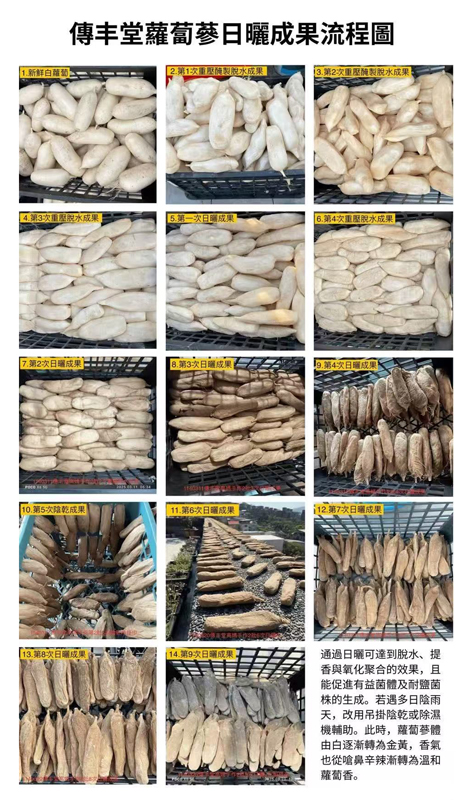 ✅ 營養價值傳丰堂的「烏金蔘」並非速成品,是時間淬鍊出來的自然產物,我們目標不是在短期內加速「老菜脯」陳化成果,而是想做出真正最好、最有營養價值、最自然美味的蘿蔔蔘。在這個漫長的陳化過程中,蘿蔔的營養成分會漸漸產生轉化與濃縮:1. 豐富膳食纖維:有助於維持消化道機能,促進腸道蠕動。2. 天然礦物質:提供日常所需的鈣、鐵等微量元素。3. 轉化後的多酚類:陳化過程產生具有潛在抗氧化能力的化合物,是日常保健的好選擇。4. 醇厚風味:時間賦予老菜脯獨特的香、甘、醇風味,是提升湯品層次的天然調味聖品。