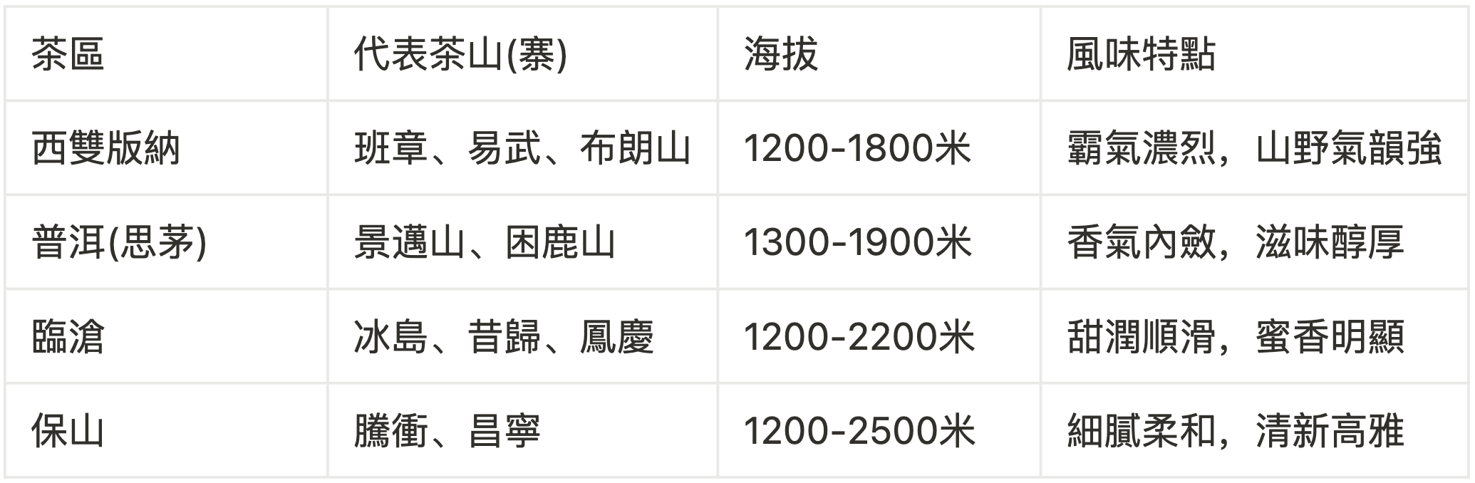 4. 保山茶區保山茶區是新興的高山普洱茶產區,主要分布在騰衝、昌寧等地。地勢高聳,海拔約1200-2500米,氣候涼爽,日夜溫差大,雲霧滋潤茶樹生長。茶園多與自然森林共生,生態環境好,部分古茶園保留野生或半野生狀態。保山茶湯細膩柔和,入口清爽,回甘快且明顯,香氣清新自然,有淡淡花香或果香,風格清新脫俗,不像西雙版納或臨滄那麼厚重霸氣,但有高山氣質和雅韻。保山茶因其清新淡雅的特點,近年受到喜歡柔和口感和高山香氣的茶友喜愛,成為值得關注的新興產區。雲南各大茶區因地勢、氣候、生態環境和製茶傳統的不同,各自發展出獨特的普洱茶風味。無論是西雙版納的山野霸氣,普洱(思茅)的內斂醇厚,臨滄的甜潤順滑,還是保山的清雅細膩,這片土地給予茶葉的,是經過時間淬煉的豐富層次和文化底蘊。下一篇「普洱研堂」,我們將一起探索六大茶山,認識這些茶馬古道上的經典產地。