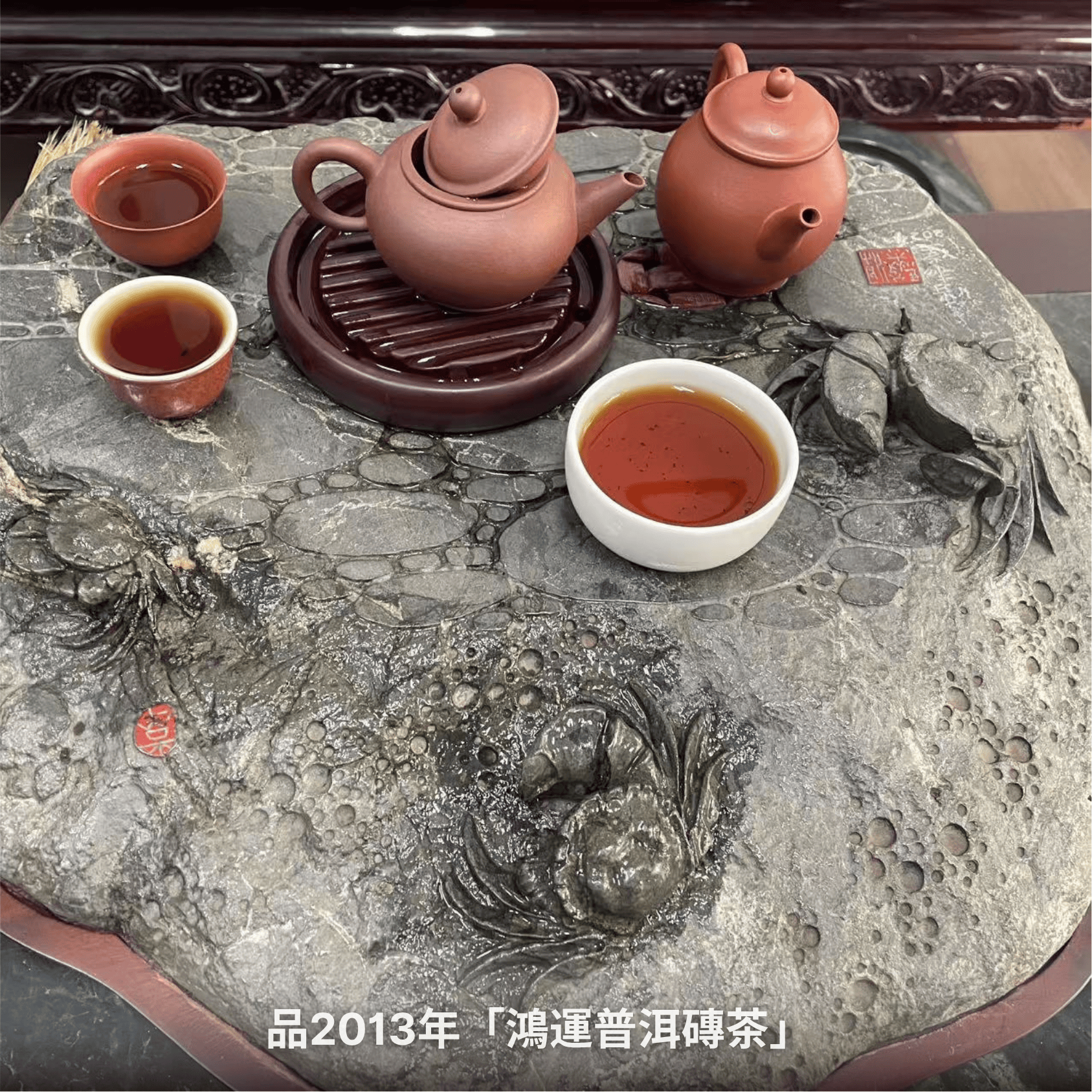 品飲2013年鄧時海老師監製之鴻運普洱熟磚茶,採用鳳慶魯史古鎮附近茶區大茶樹夏季茶菁,由十多年的老料加2013年的新料壓製而成,其發酵度約9成,級數為7~9級。歷經12年歲月的洗禮淬煉,深栗色透亮的茶湯,散發著迷人的栗子香氣,厚稠飽滿甜潤的茶湯;入喉後,喉頭及舌底濕潤、兩頰生津及具開闊感,體感舒適。這款茶讓高技師在享受品茶的美好之際,心中監製好茶的信念更加堅定!感謝各位茶友們的支持,高技師特意拿出100片(就只有100片!)的數量和您們分享,讓您們喝茶、藏茶不用繳學費,性價比真的、真的很高,有喜歡的要把握!