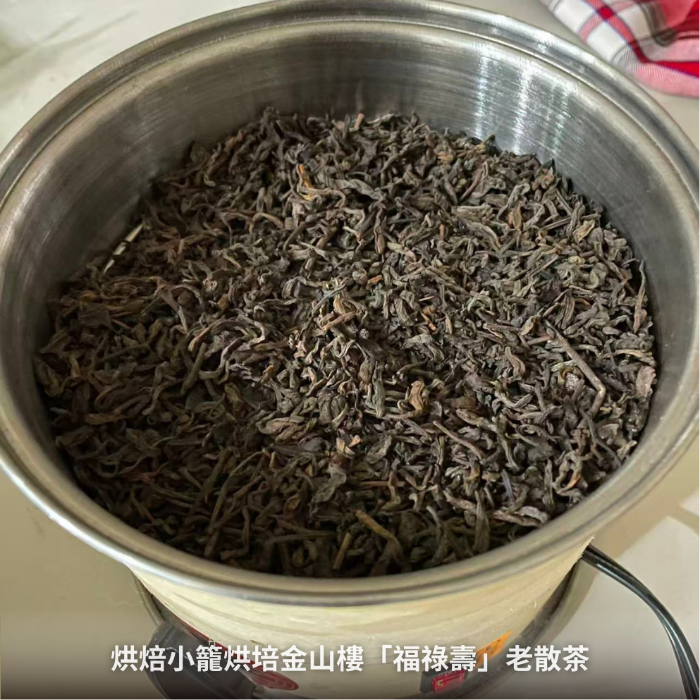 前些日子,新茶友陳董看我直播分享八○年代金山樓拼配的「福祿壽」老散茶,身為資深老散茶愛好者的他,當即私訊訂了100克回去。沒過幾天,陳董發來訊息分享品飲心得,說其在品飲前先用烘焙機稍微烘焙過,發現茶湯竟變得更加醇厚飽滿,連倉味也消失了,喝起來舒暢愉悅。他特別提醒我:「技師,這招您一定要試試!」