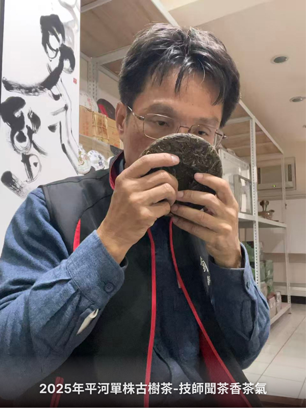 今晨,起床後,身體發出訊號告訴我,前額有微恙(有痛感),是感冒前兆;所以進公司後,從茶架上取出2025年平河單株古樹茶餅,小心謹慎打開包裝紙,看到其肥厚的條索,再看看古茶樹的劇照,真的太感動了!決定了,高技師今天要和它同頻共振,用其能量增加抗病毒的能力。輕取茶餅,聞其茶香與茶氣,很純粹、單一與迷人,太享受了。