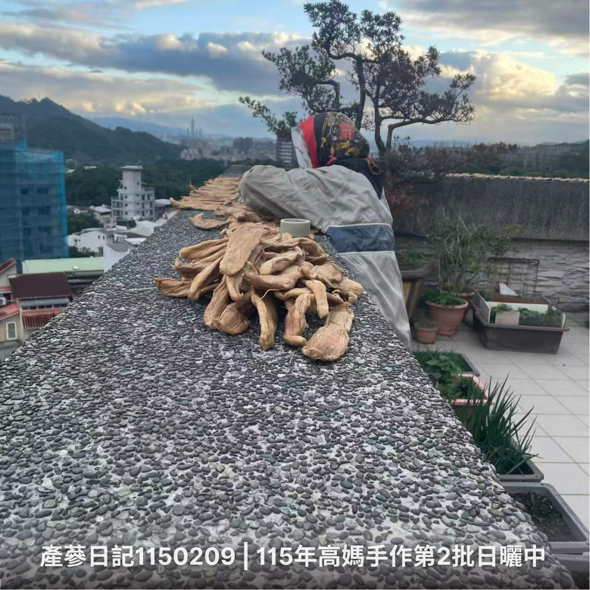 因為客戶反應高媽的蘿蔔蔘太好吃了,有媽媽的味道。這個訊息向阿母報告後,阿母就很開始努力的產製蘿蔔蔘,當作是自己的寶貝,細心呵護,深怕過程中被雨水給淋濕了,那就很麻煩了。阿母這年紀,不缺錢、不缺閒,就怕身體不好,看到阿母有興趣產蔘,於是要求自己也要努力融入,母子倆一起產蔘,並於產蔘過程中增加阿母和我的肌耐力,畢竟健康才是無價之寶。
