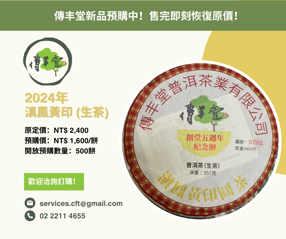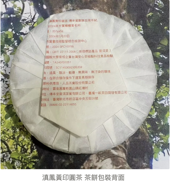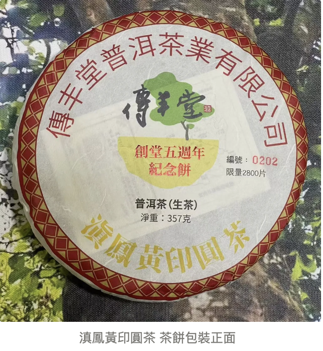 2024年 滇鳳黃印圓茶 (生茶) - 大樹頭春茶 (紅塘村):以雲南臨滄市鳳慶縣紅塘村(范家組)的大樹春茶為原料(勐庫大葉種、鳳慶大葉種、中小葉種及混生群體種),融合2023與2024年頭春茶,堅持自然農法,不施農藥,並經傳統工藝壓制而成。每餅357克,共2800片,香氣濃郁、滋味甘甜,是一款集香、釅、厚、氣、韻於一身的高端普洱生茶。- 健康品飲:通過575項農藥殘留檢測(零檢出,編號:TA240701051),以純淨、安全的茶品保障每位茶友的健康飲茶體驗。- 紀念意義:三十年前的「黃印青餅」,因其無法複製的經典特性與歲月的沉澱價值,如今成為茶人珍藏中的瑰寶,市場一餅難求。為傳承與超越這份經典,「滇鳳黃印圓茶」應運而生,作為傳丰堂五週年紀念茶品之一,以鳳慶縣紅塘村茶區的優質大樹春茶為原料,精心策畫,致力於打造一款能飄香百年的好茶,延續普洱茶的核心價值,並將其傳承給後代。