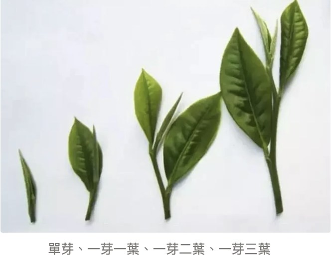 了解到「芽」與「葉」後,相信茶友們對開頭所提到的「芽茶」、「一芽一葉」、「一芽二葉」、「一芽三葉」、「葉茶」的概念就可以很直觀的理解了。沒錯!芽茶就是只含有嫩芽的單芽、一芽一葉、一芽二葉及一芽三葉為採摘時對茶葉型態的採摘標準。除了在外觀上的區別之外,不同芽葉的組合更會對茶葉口感和風味有很大的區別: