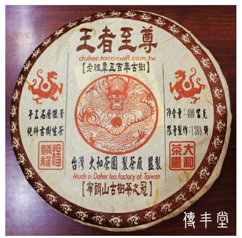 此款茶採用老班章寨樹齡500年以上古樹春茶純料茶菁壓制而成,產量為1388片,迄今陳期已達十年,是我最愛的茶品之一。為了這款茶,我費了很大的心力,花了幾年的時間,才從宜蘭大和茶園陸續運到「傳丰堂」,並繼續藏養。能收到此批優質好茶,要特別感謝楊老闆(總監)十年的眼光及膽識,因為老班章寨的好原料很珍貴並且非常搶手,需要天時、地利及人和三者齊備才能有機會擁有。同時,也因緣於2014年普洱茶市崩盤,加上楊老闆(總監)憑其多年製茶的專業、努力及人和的交際手腕,才有機會從老寨裡幾個茶農手上共1000多公斤的優質原料收購,並壓制成餅,僅製成1388片。