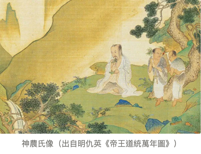 對於最初使用茶葉的人物,有流傳著兩個比較相關的神話故事。相傳在遠古時期,人們的醫藥知識還很有限,被譽為農業和醫藥之神的「神農氏」為了給人治病,時常親自到深山野嶺採集各種草藥。歷史記述上有一段話說:「神農嚐百草,日遇七十二毒,得荼而解之。」傳說神農一生下來就是水晶肚,肚子是透明的,一旦吃到有毒的食物,就會變黑。有一天,神農吃了72種有毒的植物,吃到腸子都變黑了,後來他又吃了一種葉子,這個葉子,竟然把腸胃裡的毒都解了。神農就把這個葉子叫做「查」,就是我們現在所說的茶葉這個「茶」。