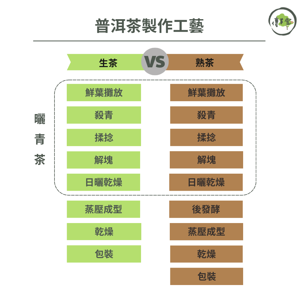 我們知道,普洱茶有生普與熟普(以及新工藝製成的青普),或許有些茶友會認為,把生茶放久就會變成熟茶,因生茶存放多年會慢慢陳化,最終呈現深色的茶湯,與熟茶類似。然而,若更仔細深入看,事實並非如此,兩者存在一定區別。因熟茶是透過「渥堆」在短短幾日/週,加速完成發酵的茶類,生茶則不經渥堆,靠時間與環境緩慢的進行雙後發酵的轉化,兩者在路徑不同,風味與質地也具有一定的區別。