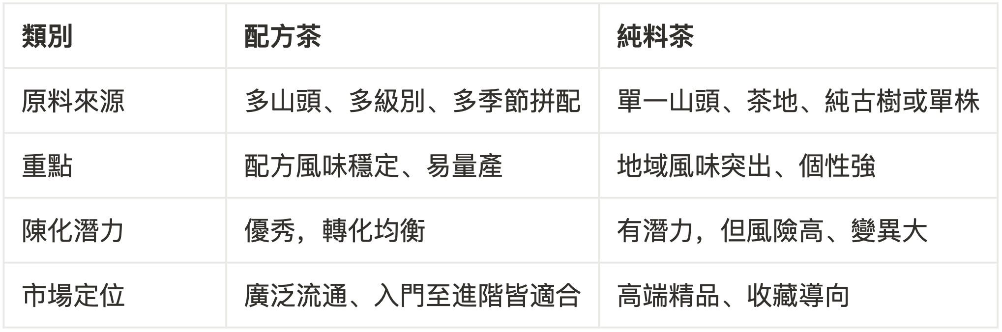 然而,拼配茶也因其非單一來源而一度被認為不如純料茶來得「高端」或「真實」,但事實上,許多經典拼配茶款經歷數十年的時間檢驗,其穩定性與陳化表現已成為普洱茶市場的重要參考。