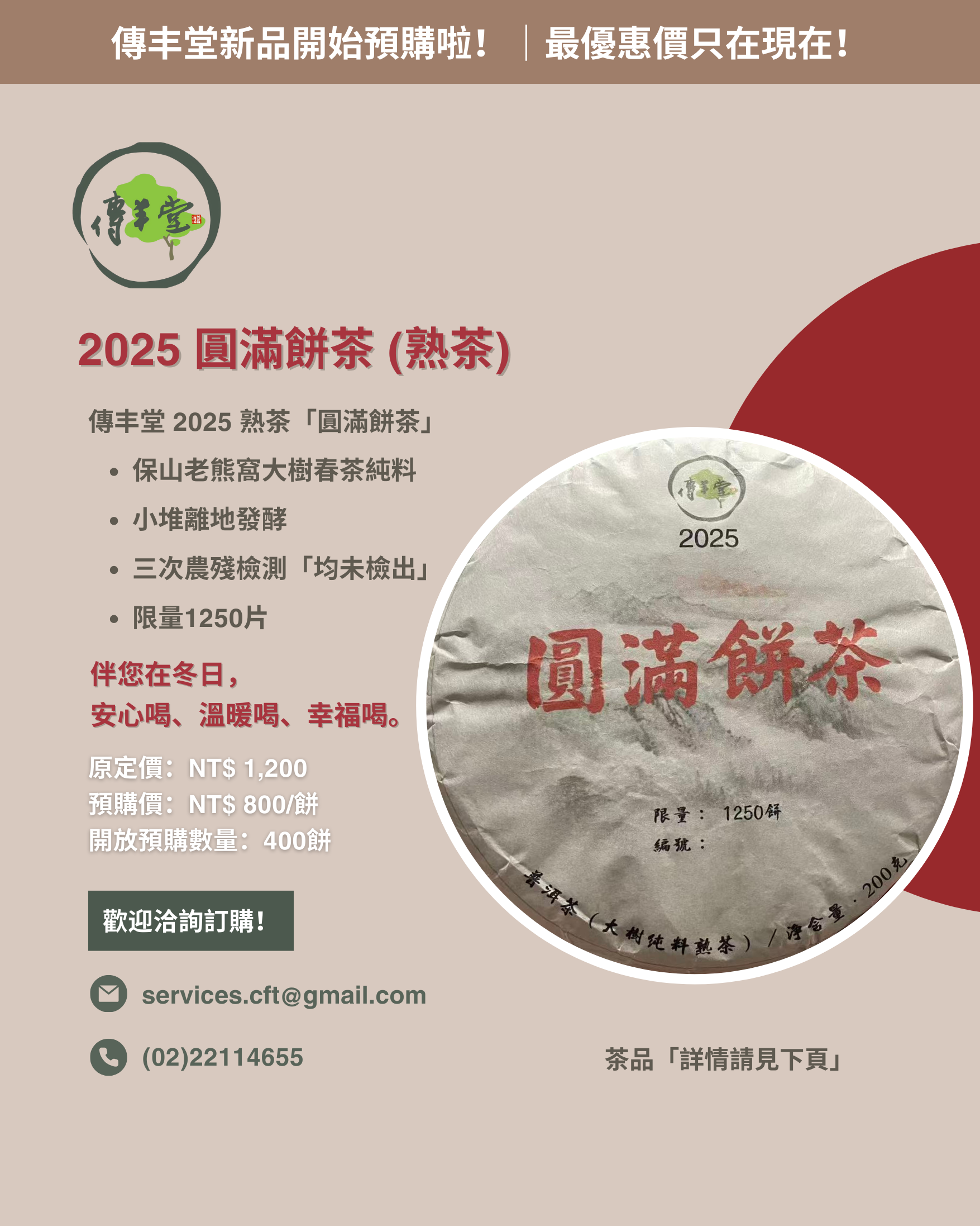 傳丰堂2025 熟茶「圓滿餅茶」,選用保山老熊窩茶區百年以上大樹頭春純料曬青毛茶,採用小堆離地發酵工藝產製,農殘檢測「均未檢出」,伴您在冬日,安心喝、溫暖喝、幸福喝。