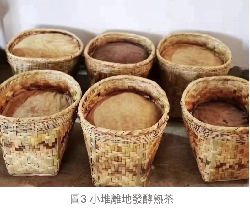 現代小堆離地發酵工藝進入2010年後,伴隨時代的進步及消費者對乾淨衛生的重視與對高端大樹、古樹熟茶的期待,「小堆、離地發酵」工藝應運而生(圖2、圖3)。因為小堆,所以可使用高端大樹、古樹春茶原料(100公斤即可)。因為乾淨衛生,所以採用離地發酵工藝。因為要能越陳越香,所以採用較輕微的發酵程度,如此不僅保留茶葉中的部分活性物質,更便於後續陳化發酵。