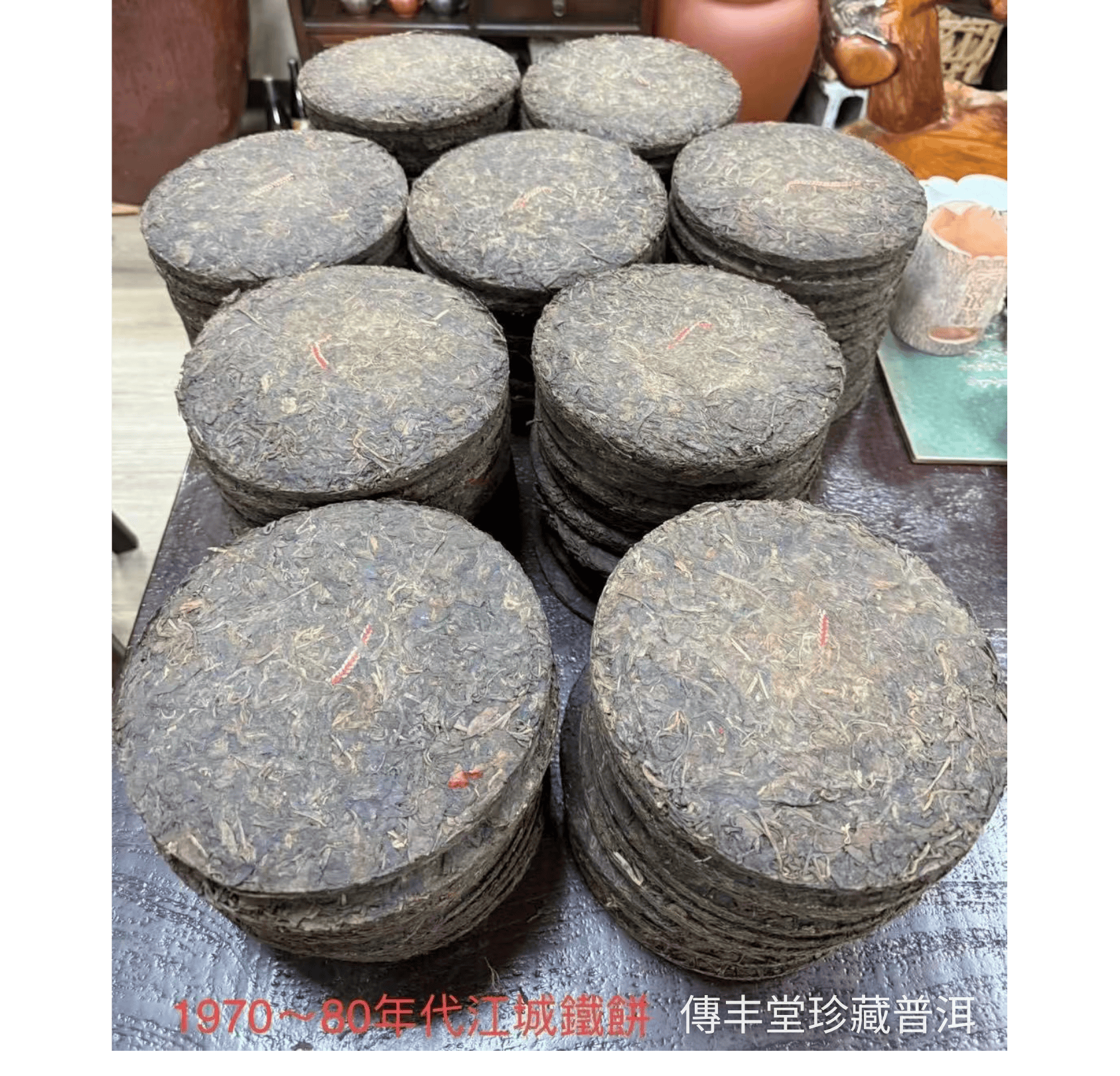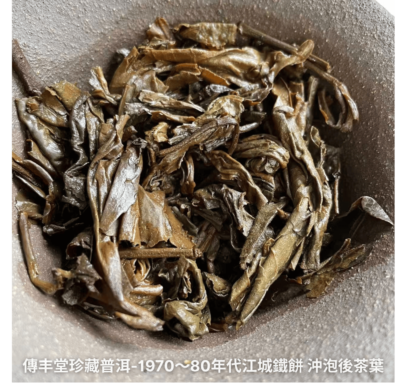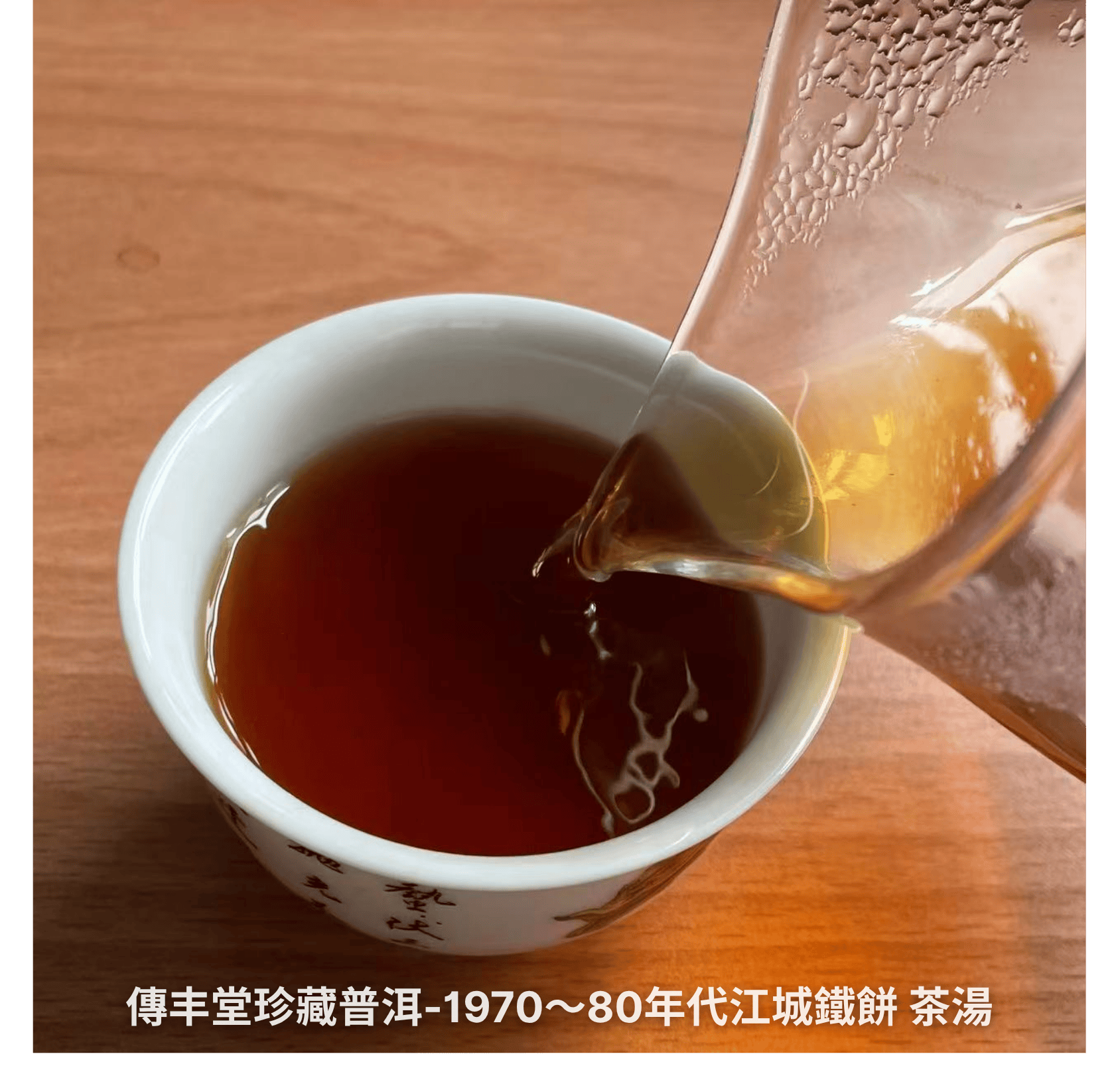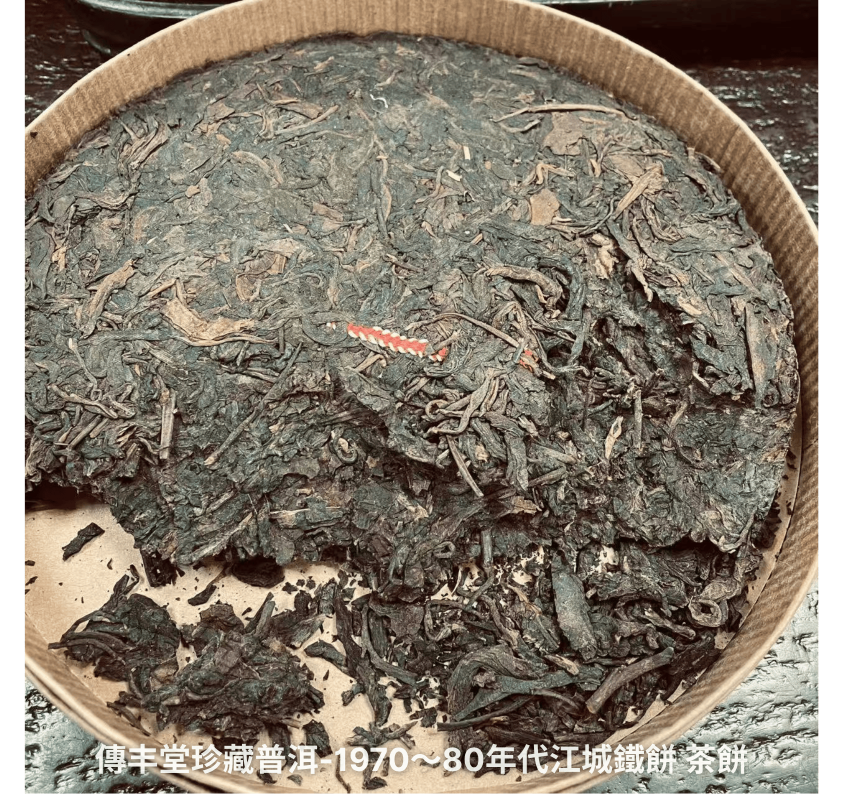 1970~80年代的江城鐵餅,是為喬木手工模壓制的茶品,因為單一茶菁,且茶質釅厚,在市場上有一定知名度,其資源在幾位固定藏家手中。高技師與這款茶結緣於大友廖院長的直播頻道,直播中廖院長分享此款茶品的茶樣。第一次喝到茶樣時,因為茶齡尚短,只覺得此款茶湯濃郁釅厚,木質老韻香氣迷人,但因為釅度強而不太討喜,不過仍在心中留下了印象。那時尚未了解其越陳越香的真諦。