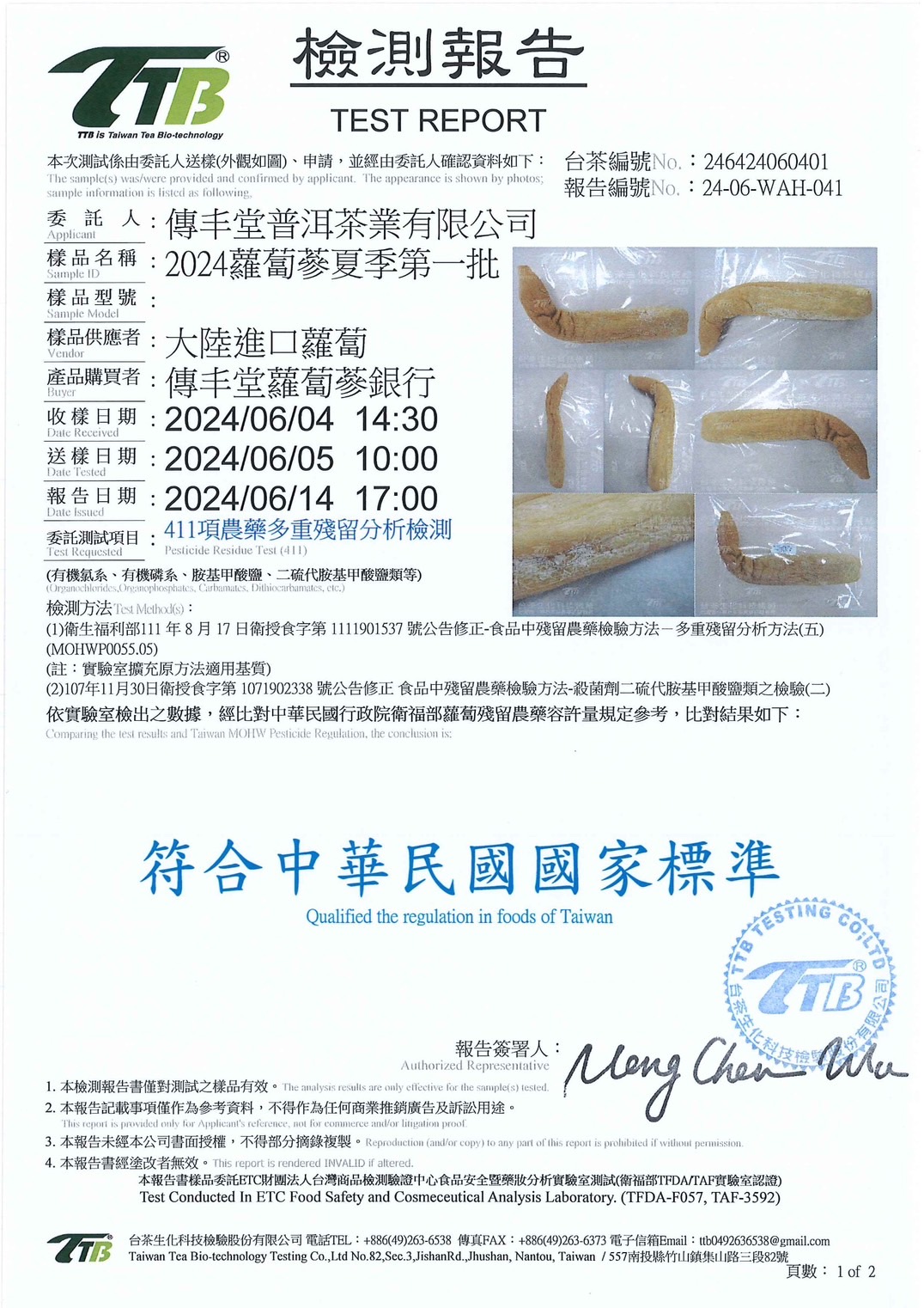 材料好、工藝純,在加上時間的發酵陳化,日後才能成就 傳丰堂蘿蔔蔘銀行的「烏金蘿蔔蔔蔘」。就經驗而言,白蘿蔔越大,符合農藥殘留的標準難度越高(為讓白蘿蔔皮賣相好,所以必須用藥殺蟲),所以傳丰堂的產品原料,都必須先經農殘檢測這道關卡把關,確保商品品質安全無虞!