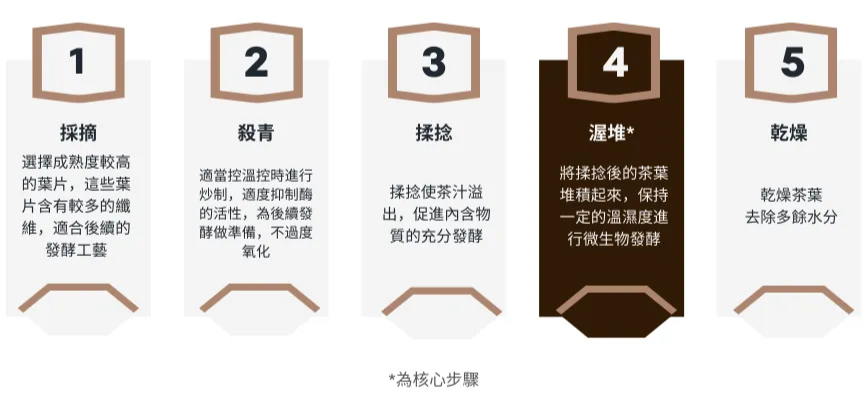 黑茶黑茶是後發酵茶,黑茶的製作工藝複雜,包含殺青、揉捻、渥堆發酵和乾燥,這些工藝賦予了黑茶獨特的醇厚與陳香。以下是黑茶的主要製作步驟:黑茶具有獨特的陳香和醇厚的口感,隨著陳放時間的增加,風味越發濃郁。黑茶有助於促進腸胃健康、降脂減肥,特別適合重視養生的茶友。