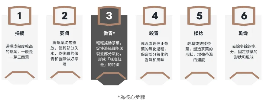 烏龍茶烏龍茶是一種半發酵茶,製作工藝介於綠茶和紅茶之間,結合了輕度發酵與殺青,形成了豐富的層次感和獨特的香氣。烏龍茶通常選擇成熟度較高的茶葉,一般是一芽三四葉,這樣的葉子富含多酚,適合進行部分發酵。烏龍茶製作的核心步驟是做青,這是形成烏龍茶獨特風味和香氣的關鍵所在。做青通過搖青及晾青,促使茶葉邊緣細胞破裂並部分氧化,這樣的過程使烏龍茶具有「綠底紅邊」的特徵。以下是烏龍茶的主要製作步驟:烏龍茶的做青步驟是其製作中的核心,通過輕度發酵和搖青來形成其獨特的層次感和濃郁香氣。烏龍茶具有濃厚的滋味和持久的香氣,並具有其特有的半發酵特性,這使得它在風味上介於綠茶和紅茶之間。相比其他茶類,烏龍茶的優點在於其既保留了綠茶的清新,又融合了紅茶的甜醇,形成了獨特的花果香和多層次的口感。