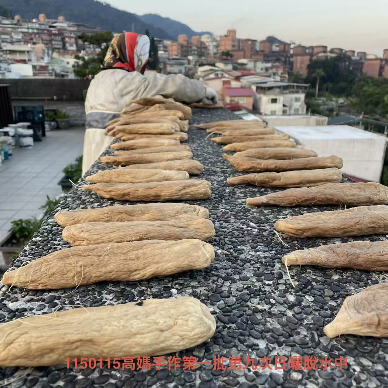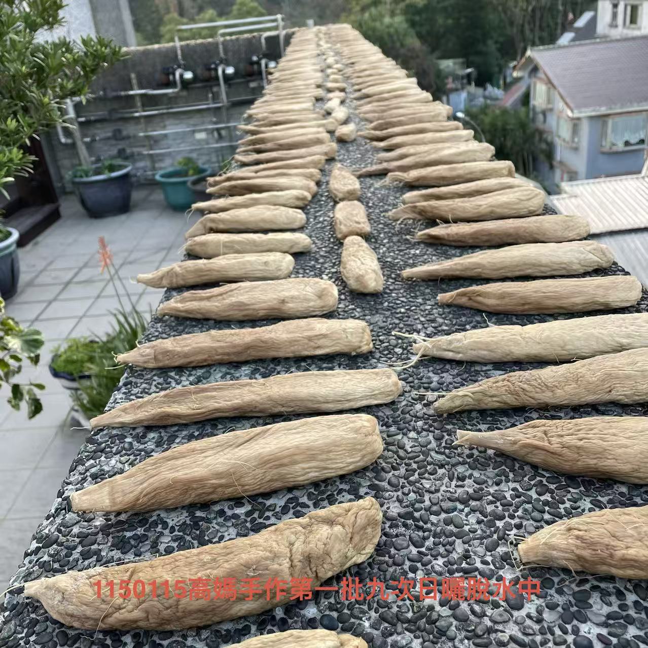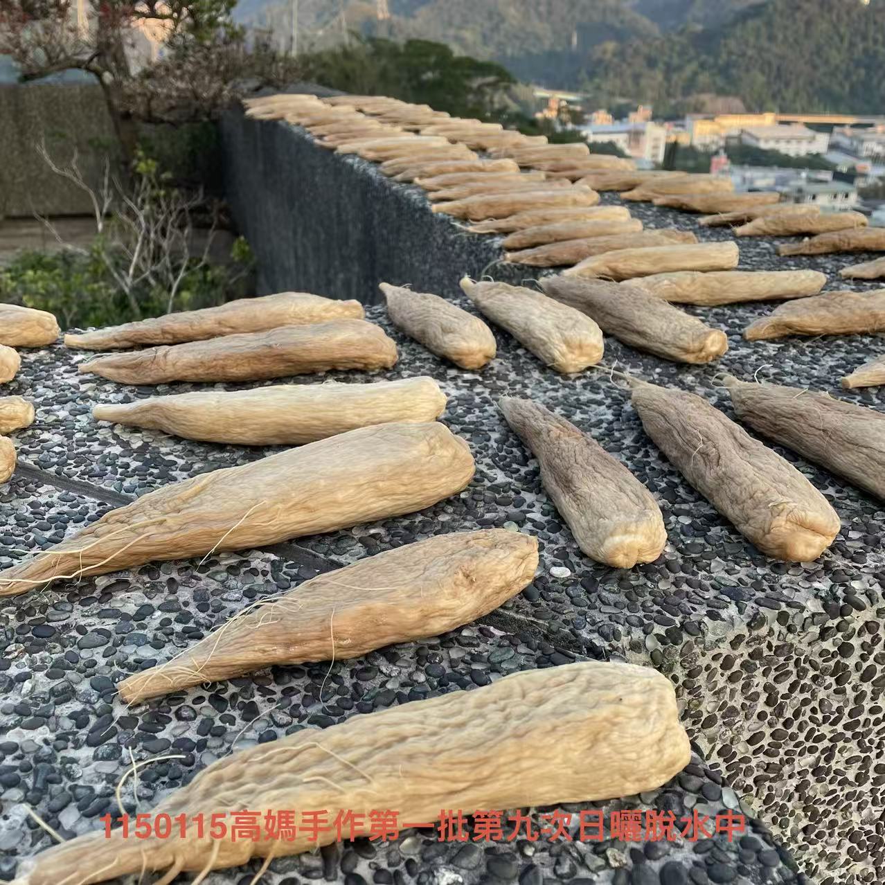 第一批蘿蔔蔘的產製,今天已進入第9次脫水工序。看這批蘿蔔質地很紮實,很有可能打破紀錄,預計需要12到13次的反覆脫水,才能完成產製裝罐。
