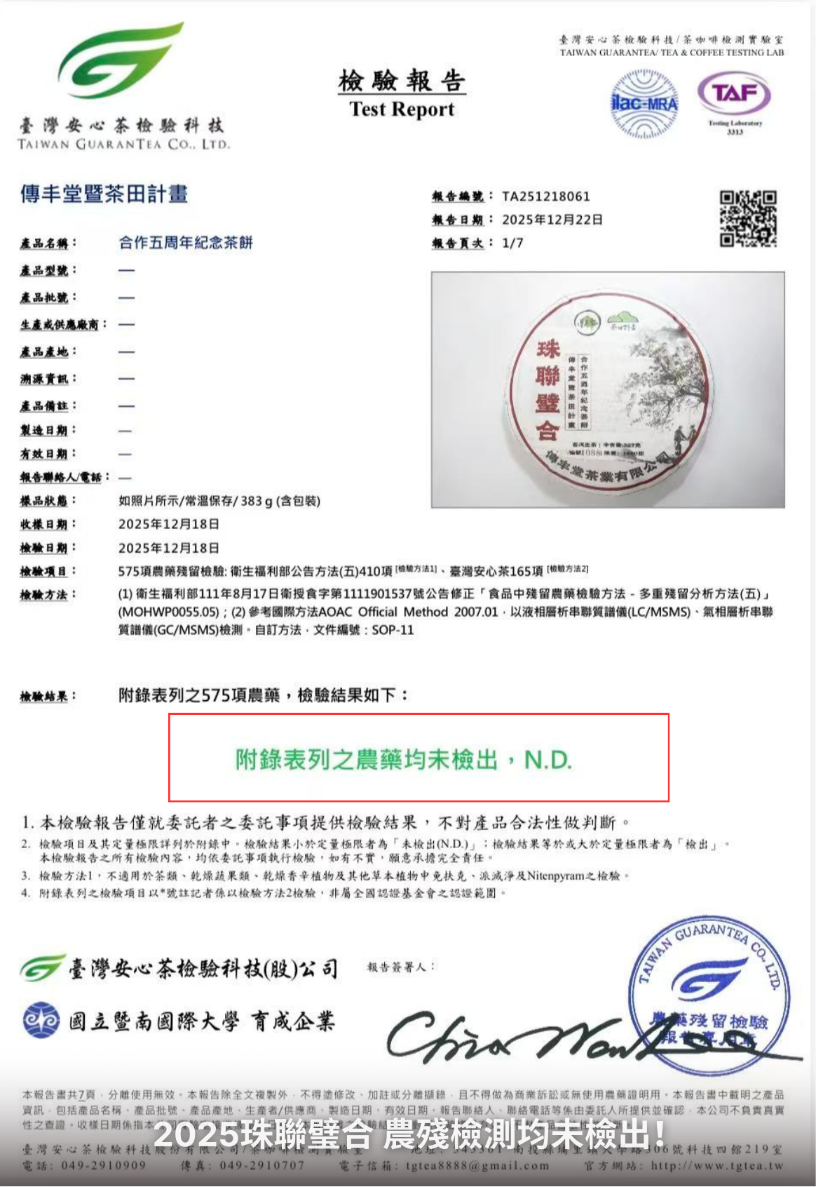 除了品飲口感與普洱茶的陳化價值外,喝茶,喝的是茶樹的健康力、生命力、與長壽力等營養物質。因此,傳丰堂堅守食安底線,堅持每款監製的茶品都要滿足大樹、古樹等級的春茶原料,採自然農法,且要經過三次農殘檢測均未檢出方可上架。2025年「珠聯璧合」普洱生茶也不例外,從原料採摘、初製到成品入庫,歷經了三次嚴格的農藥殘留檢測。最近一次(1141218)由「台灣安心實驗室」進行的575項檢測結果證實:所有項目均未檢出。