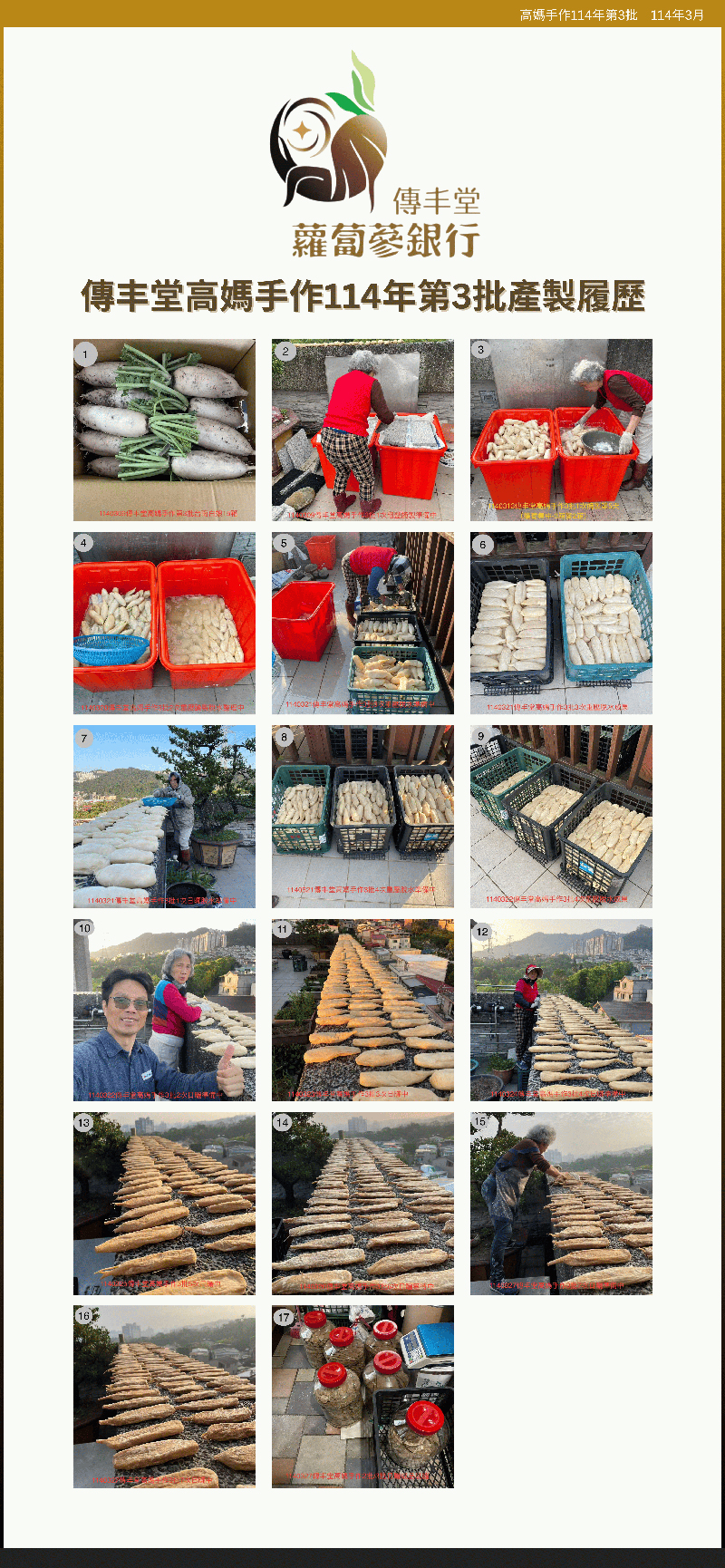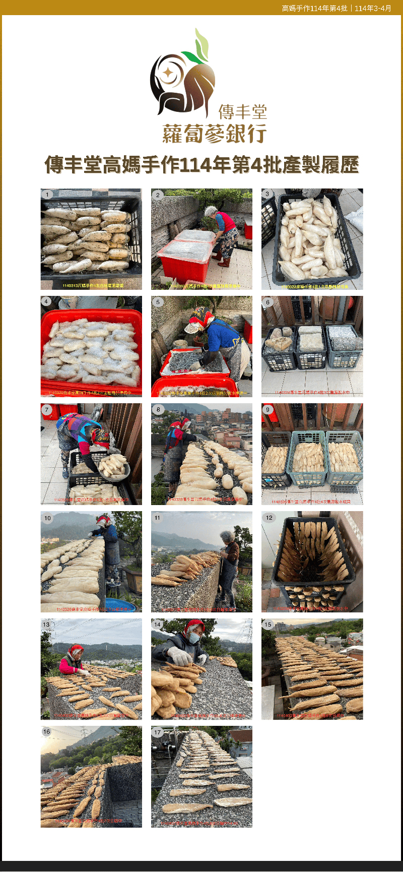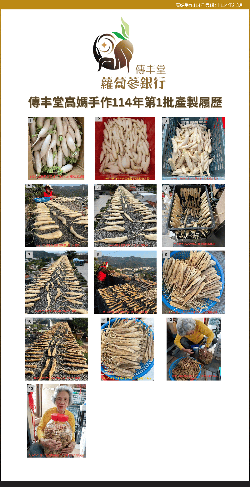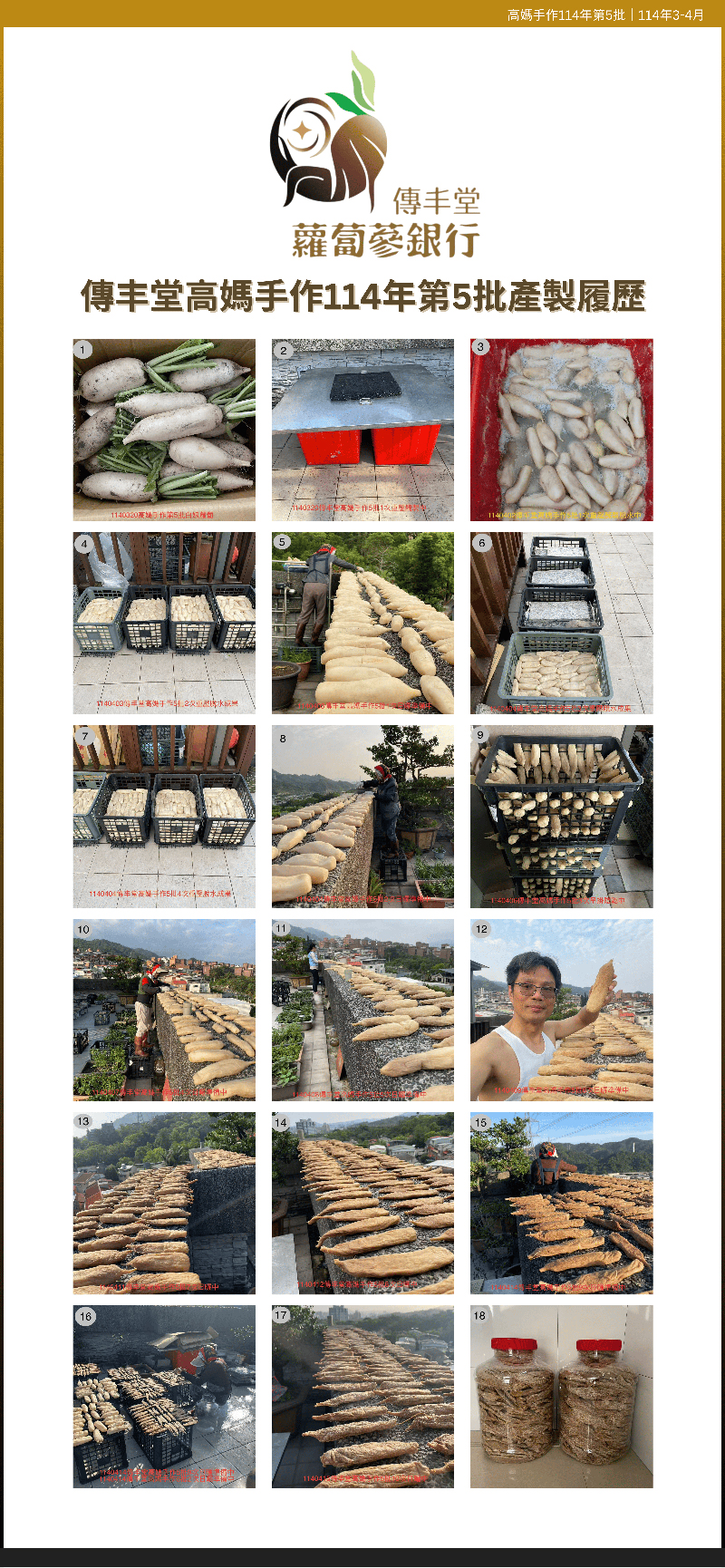 因為阿母的堅持與用心,為了讓更多的朋友、客戶了解、認識一條「白蘿蔔」如何變成一條有生命的「蘿蔔蔘」,其產製過程的繁雜與辛勞,所以產蔘過程中,高技師努力用照片幫阿母做紀錄,除了當「蘿蔔蔘」產製履歷紀錄外,更是幫阿母的樂觀、正向、堅持的人生態度留下珍貴紀錄。