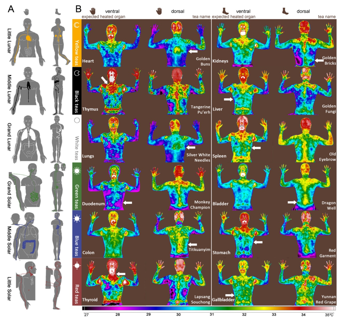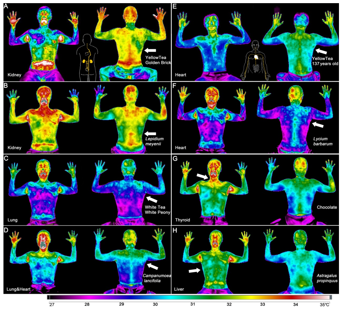 科學研究:茶對經絡的影響2020年,學者李輝教授等人嘗試運用現代紅外熱像技術觀察「茶葉激發的人體紅外影像顯現經絡系統」,為《黃帝內經》所描繪的經絡系統提供一個可觀察、可測量的實體依據。其採用紅外熱像技術,在控制條件下(如對實驗參與者進行條件篩選與飲食控制),觀察人們在飲用不同茶品前後(飲茶後10-15分鐘),身體溫度變化。