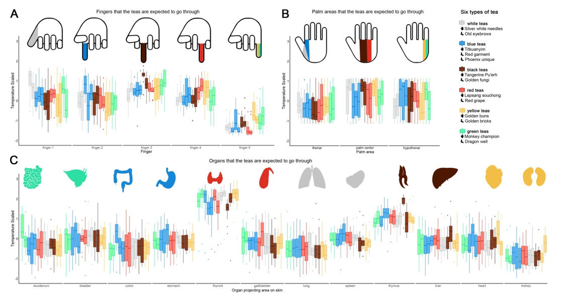 那麼,這項研究究竟「看到」了什麼?根據圖1顯示,飲用不同茶類後,身體的不同部位產生了體溫變化,六種茶(黃茶、黑茶、白茶、綠茶、青茶、紅茶)恰巧對應到不同器官(心臟、腎臟、胸腺、肺臟、脾臟等),溫度範圍從27°C到35°C。此外,研究還展示了各種茶與草藥對經絡影響的對比實驗結果(圖2),包括對腎經、肺經、心經、甲狀腺和肝臟的影響,顯示茶葉比一般草藥對經絡的激活效果更明顯、更精確。作者還研究了不同手指對應的茶類溫度變化(圖3),很奇妙的是每種茶對手指的影響也是一一對應的。如何理解該研究?實驗結果的「一茶對一經」令人感到讚嘆,也同時帶來了巨大的爭議,李輝教授表示,這類研究仍處於初步的探索階段。然而,這個實驗的價值之處在於,其通過現代化的科學,讓人們流傳已久,僅僅通過口述其感受的體感、茶氣,可以實際「看到」。那股暖流及舒暢、通透感,並非虛無的感受,而是確實能引起身體生理指標變化的真實反應。