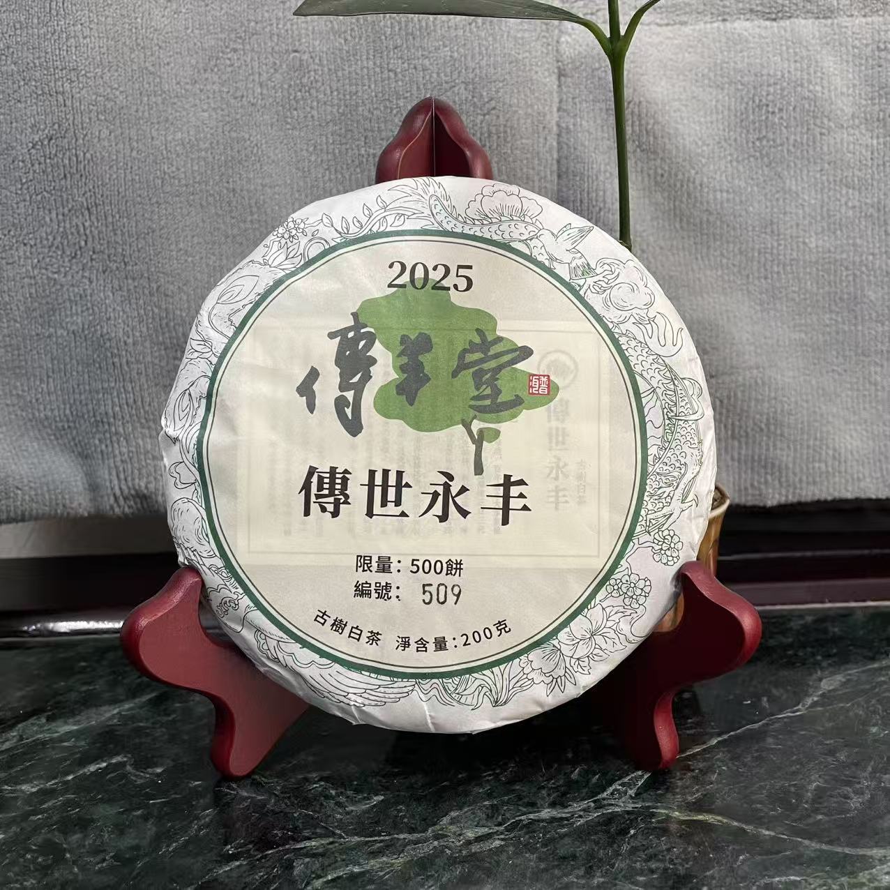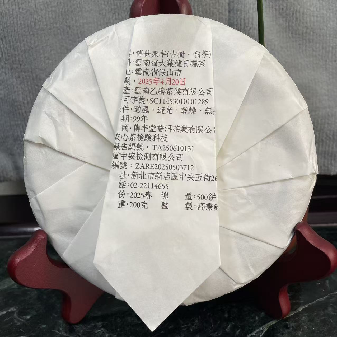 2025「傳世永丰」古樹白茶保山秘境古樹春茶:採自雲南保山茶區海拔約2100米的秘境古樹茶菁為原料,經傳統炒青曬青工藝,每餅200克,限量500餅。茶湯特質:具蘭花香氣,茶湯滋味豐富,口感細緻鮮爽且濃郁飽和度佳,飲後生津持續且回甘反應明顯,整體體感表現令人舒暢。健康保障:傳統工藝製作,越陳越香,且每片皆有獨立身分編號;通過575項農藥殘留檢測(零檢出,編號:TA250610131, TA250821111),乾淨純淨,讓您安心喝,放心藏。特殊意義:「傳世永丰」象徵茶樹生命的延續與豐收的祝福,希望能夠將這款優質珍貴的產品如其古樹深根般立足生長,並將這份美好、健康、長壽、生命力傳承下去。