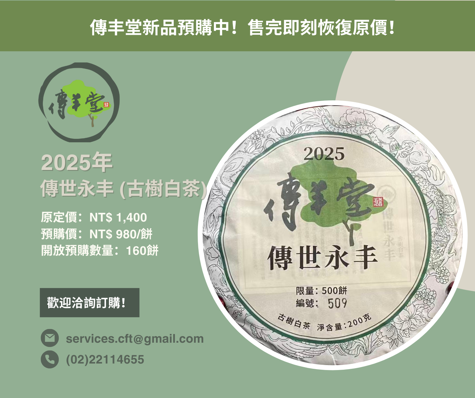 各位茶友有福啦!傳丰堂堅持採用頭春茶、春茶為原料,並選用傳統、衛生工藝產製,目的就是要讓茶品能夠越陳越香、有質有韻。因優質原料產量有限,每批次皆為限量精品。為了感謝茶友支持,也為了實現我們共好的理念,新品上市特別推出預購優惠價讓利給茶友們!「好茶來自好原料」,因此傳丰堂始終堅持選用頭春大樹、古樹茶,並以公開透明的產製工藝,讓每一餅茶都能越陳越香,經得起時間考驗。本品以「傳世永丰」為名,寓意世代永續、豐厚綿延,代表我們對自然與茶樹生命力的敬重。「傳世永丰」系列有「古樹生茶」與「古樹白茶」,採用雲南保山秘境古樹春茶,原料共320公斤,每餅200克,產製生茶1100餅,白茶500餅。