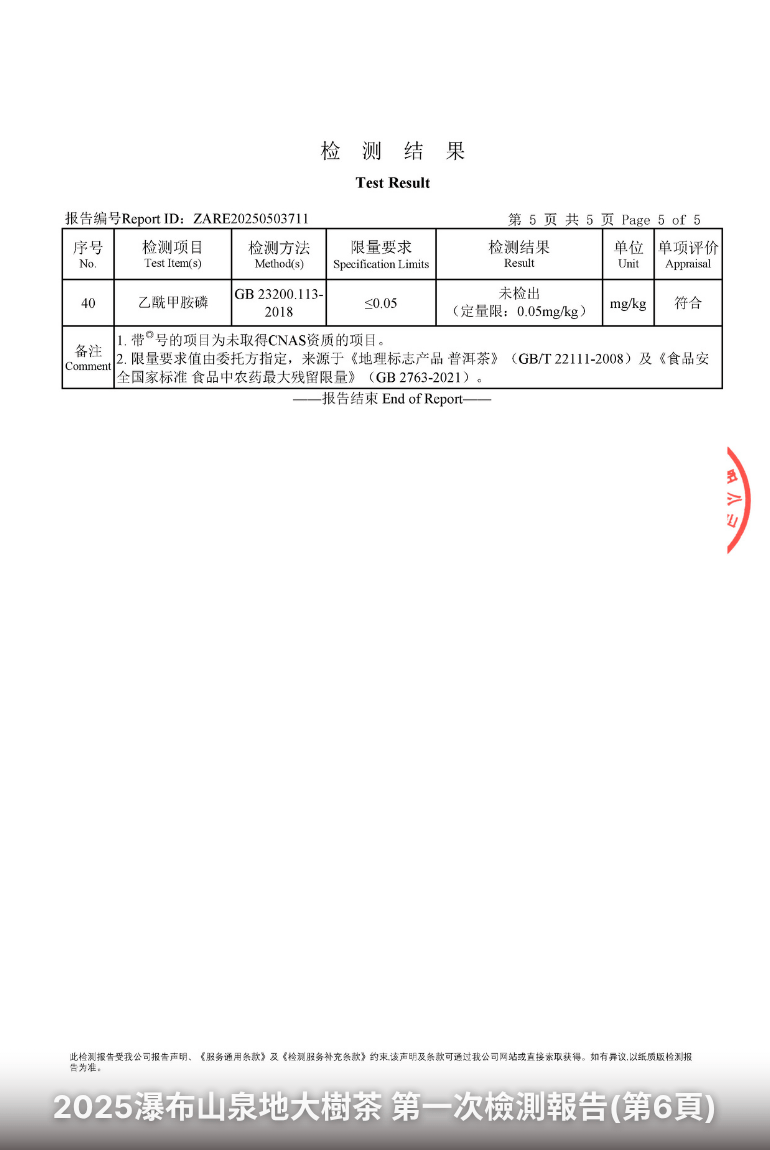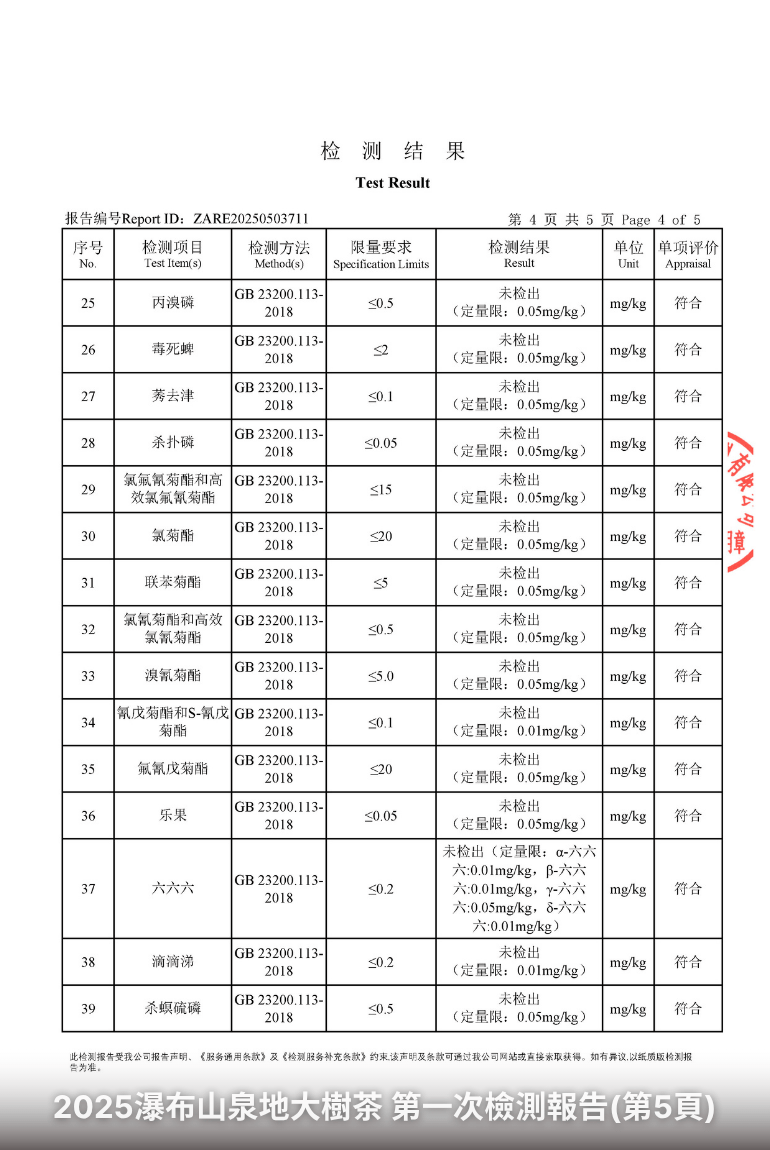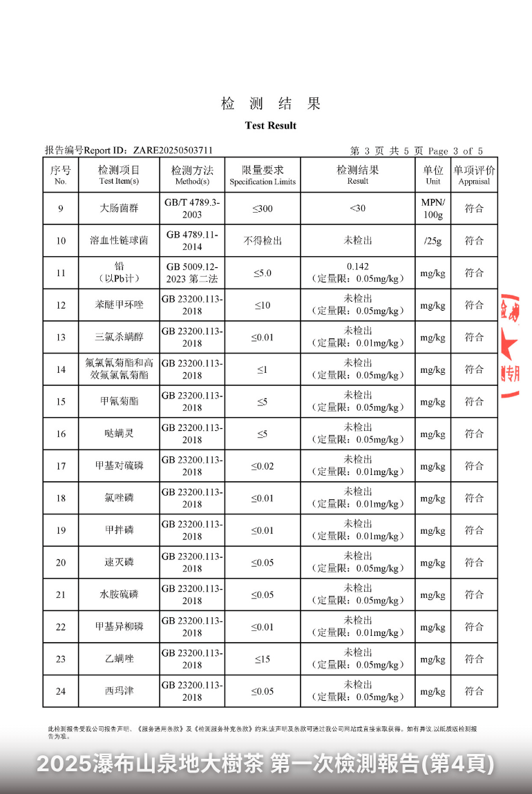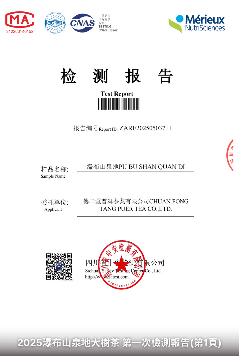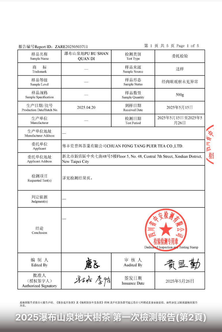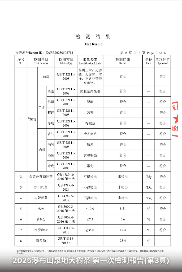 如何看懂茶葉檢測報告?你該注意的重點當你購買茶葉時,若能看到完整的檢測報告,將有助於了解茶的品質與安全性。但該如何閱讀這些報告呢?以下為幾項關鍵指標與解讀方式:以下為一份實際檢測報告:傳丰堂2025瀑布山泉地大樹茶第一次檢測報告: