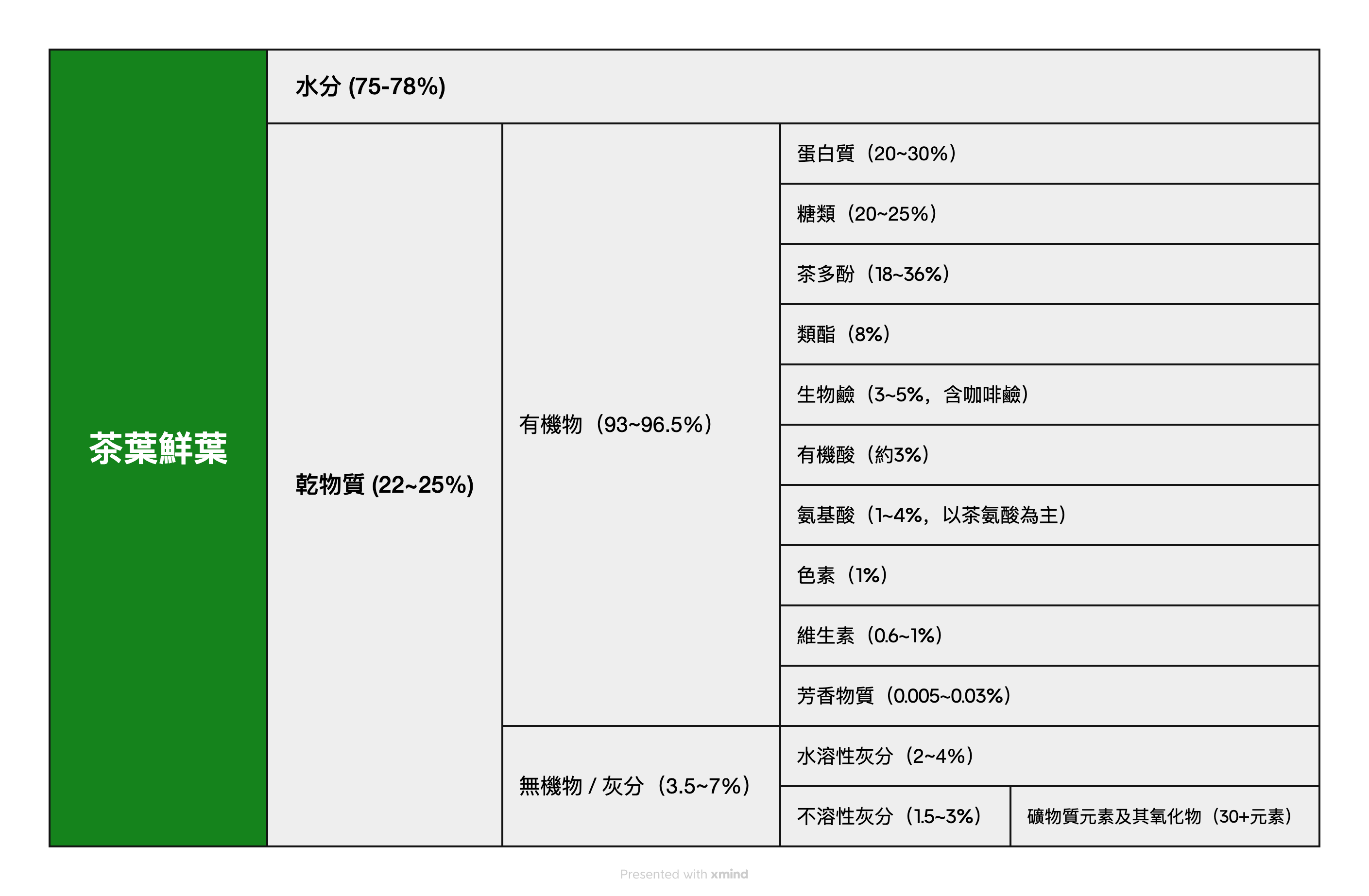 - 茶多酚:主要為幾類兒茶素、葉綠素、胡蘿蔔素。影響茶葉色澤,決定澀味,紅茶中會轉化為茶紅素、茶黃素等色素- 氨基酸(如茶氨酸):帶來鮮爽甘甜感- 咖啡鹼:提供提神效果與苦味- 芳香物質:產生茶香,在鮮葉中有87種、綠茶中有260多種、紅茶中已發現 400 多種