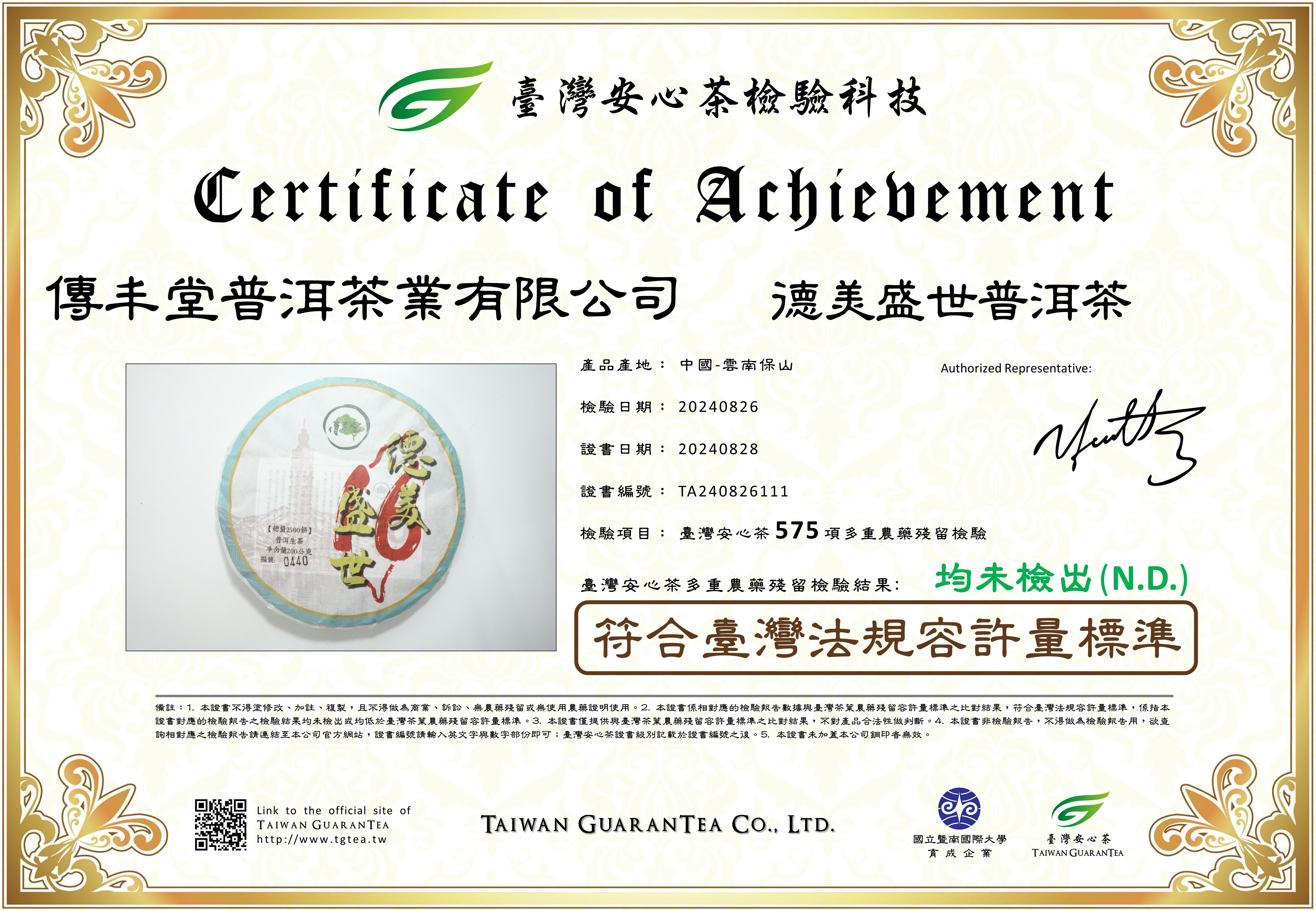 今年茶山因雨水較少,所以整體茶質在香氣、滋味、韵味與口味方面都有很不錯的表現。保山貓耳朵大茶樹,於海拔高度約2000公尺,為中小葉種,在雲南茶區裡屬於稀有茶種,其茶區生態優質及多樣性。難得今年可收到約500公斤的產量,就用它們來產製台灣「德美盛世」紀念餅。