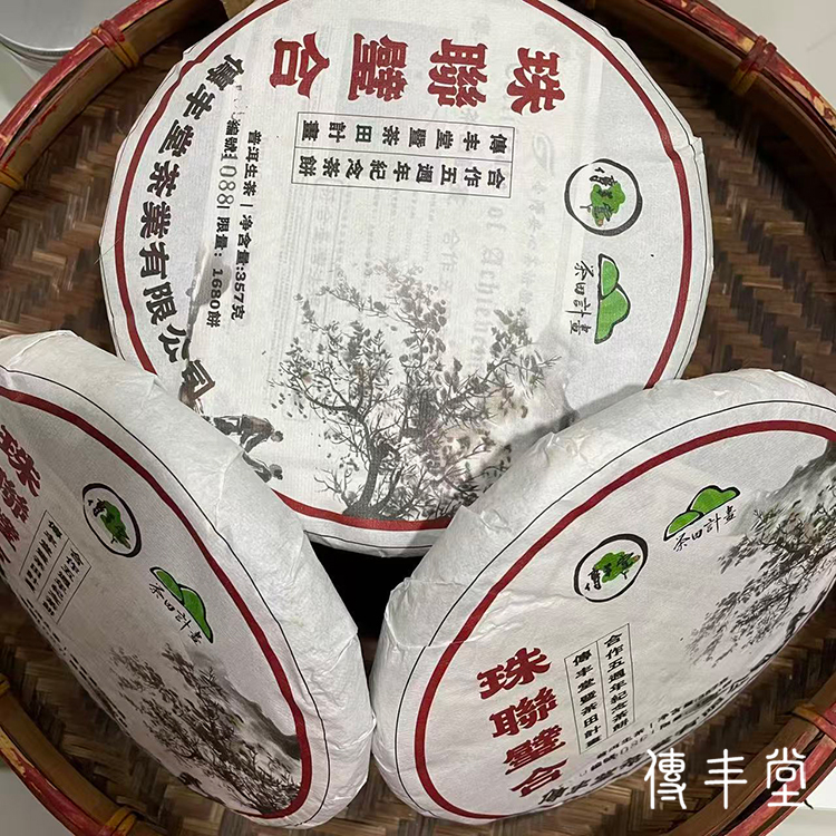 「珠聯璧合」一者象徵「傳丰堂」與「茶田計畫」五年合作紀念;二者象徵南糯山與鳳慶大樹茶,以最適合的6:4拼配比例,為一款具有「香、釅、厚、氣、韻」的「越陳越香」珍藏密碼的優質好茶。