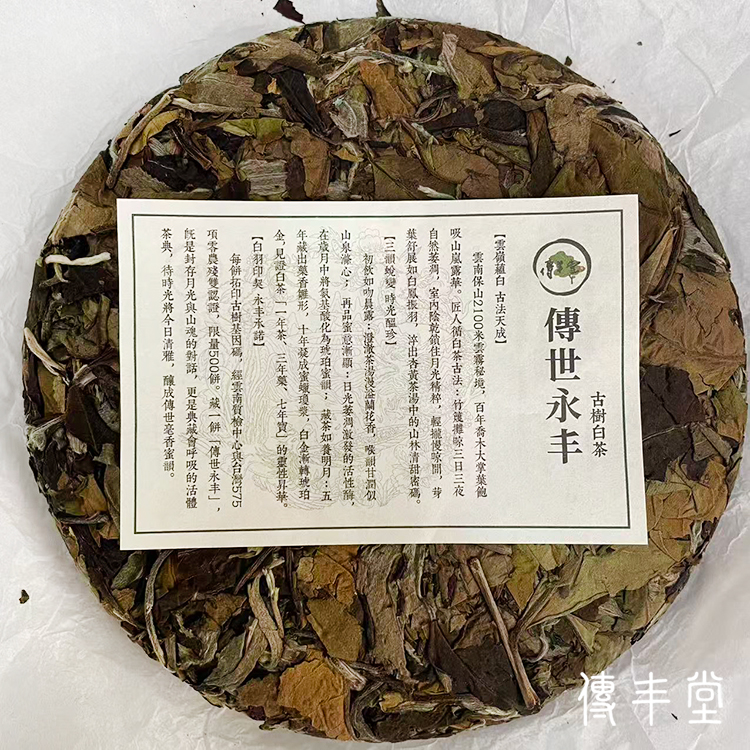 本品採用保山茶區海拔約2100米的秘境古樹茶菁為原料,數量僅320公斤,為了讓茶友可以喝到因為不同製茶工藝而有不同滋味的優質古樹茶品,將320公斤的原料,分別用來產製生普200公斤與白茶120公斤。同時,希望能夠將這款優質珍貴的產品如其古樹深根般立足生長,並將這份美好、健康、長壽、生命力傳承下去,故命名為「傳世永丰」。