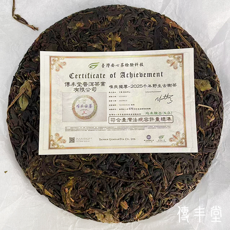 本款茶品延續去年2024「唯我獨尊」千年野生古樹茶,很幸運今年仍有原料能夠產製新的一批。採用珍貴國有林野生古樹茶菁為原料,數量較去年更少,僅有120公斤,將其產製為精品生茶。因為原料得來不易、產製過程繁雜,能否有下一批還是未知數,顧我將其取名「唯我独尊」。
