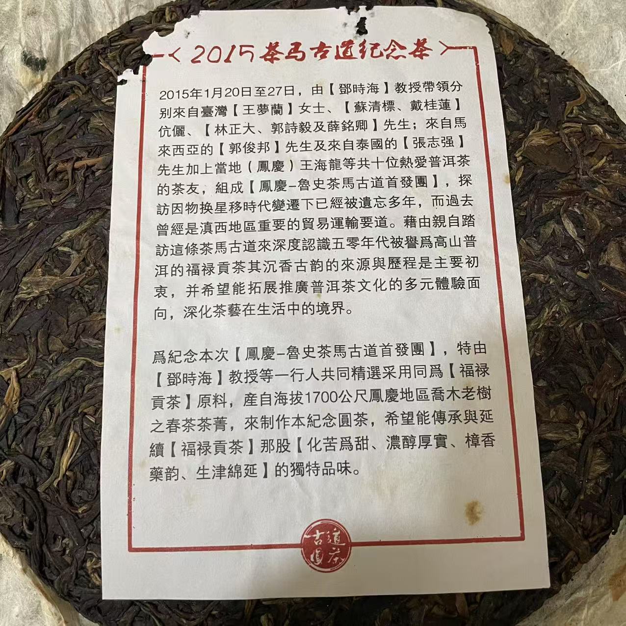 2015年1月20日至27日,由【鄧時海】教授帶領分别來自臺灣【王夢蘭】女士、【蘇清標、戴桂蓮】伉儷、【林正大、郭詩毅及薛銘卿】先生;來自馬來西亞的【郭俊邦】先生及來自泰國的【張志强】先生加上當地(鳳慶)王海龍等共十位熱愛普洱茶的茶友,組成【鳳慶-魯史茶馬古道首發團】,探訪因物换星移時代變遷下已經被遺忘多年,而過去曾經是滇西地區重要的貿易運輸要道。藉由親自踏訪這條茶馬古道來深度認識五零年代被譽爲高山普洱的福祿貢茶其沉香古韵的來源與歷程是主要初衷,并希望能拓展推廣普洱茶文化的多元體驗面向,深化茶藝在生活中的境界。 爲紀念本次【鳳慶-魯史茶馬古道首發團】,特由【鄧時海】教授等一行人共同精選采用同爲【福祿貢茶】原料,產自海拔1700公尺鳳慶地區喬木老樹之春茶茶菁,來制作本紀念圓茶,希望能傳承與延續【福祿貢茶】那股【化苦爲甜、濃醇厚實、樟香藥韵、生津綿延】的獨特品味。