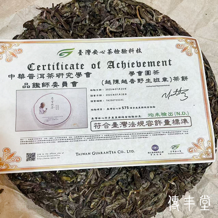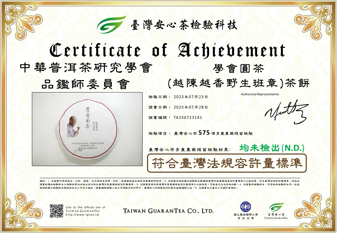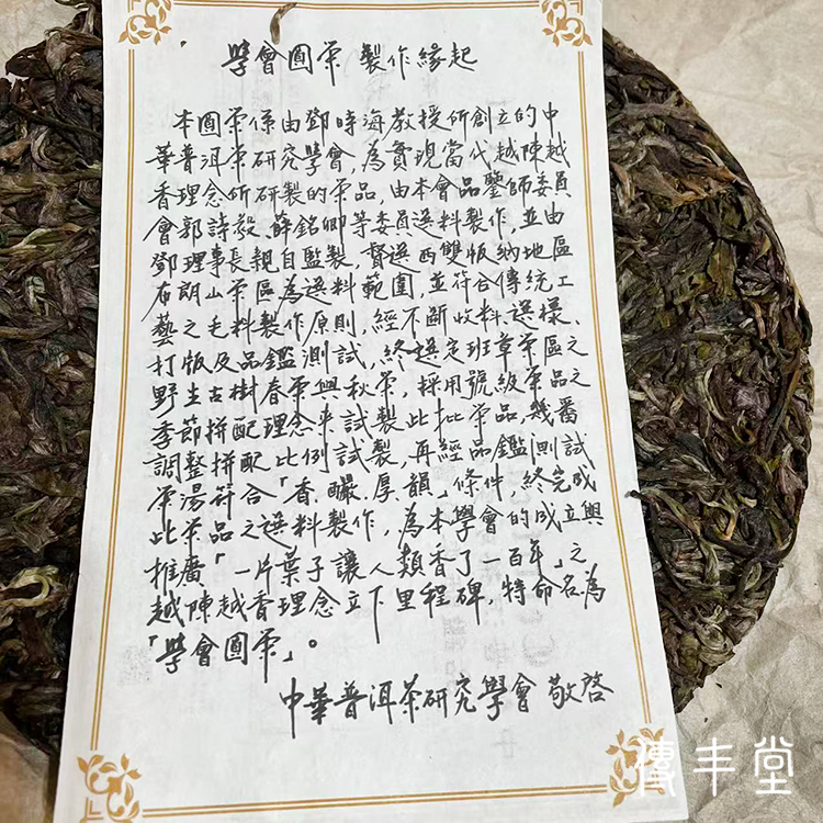 本圓茶係由鄧時海教授所創立的中華普洱茶研究學會,為實現當代越陳越香理念所研製的茶品,由本會品鑑師委員會郭詩毅、薛銘卿等委員選料製作,並由鄧理事長親自監製,督選西雙版納地區布朗山茶區為選料範圍,並符合傳統工藝之毛料製作原則,經不斷收料、選樣、打版及品鑑測試,終選定班章茶區之野生古樹春茶與秋茶,採用號級茶品之季節拚配理念來試製此批茶品,幾番調整拚配比例試製,再經品鑑測試茶湯符合「香、釅、厚、韻」條件,終完成此茶品之選料製作,為本學會的成立與推廣「一片葉子讓人類香了一百年」之越陳越香理念立下里程碑,特命名為「學會圓茶」。